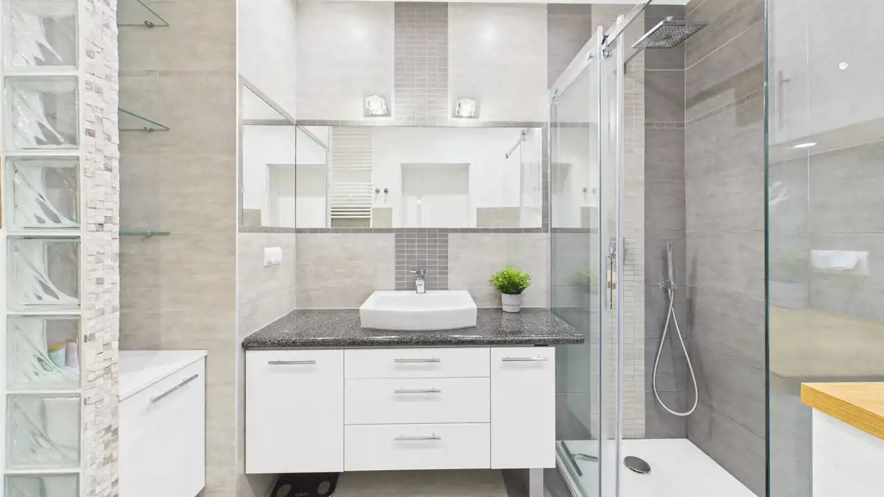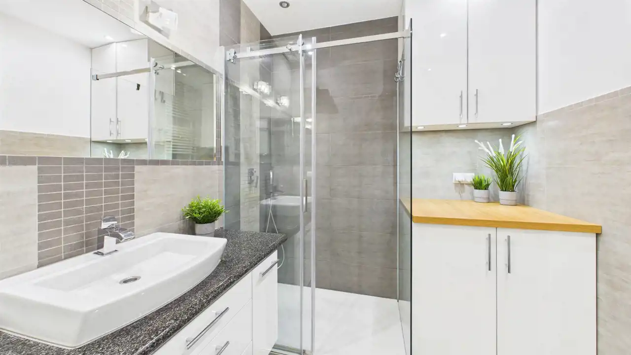 Łazienka z prysznicem typu walk-in oraz pralką w zabudowie.