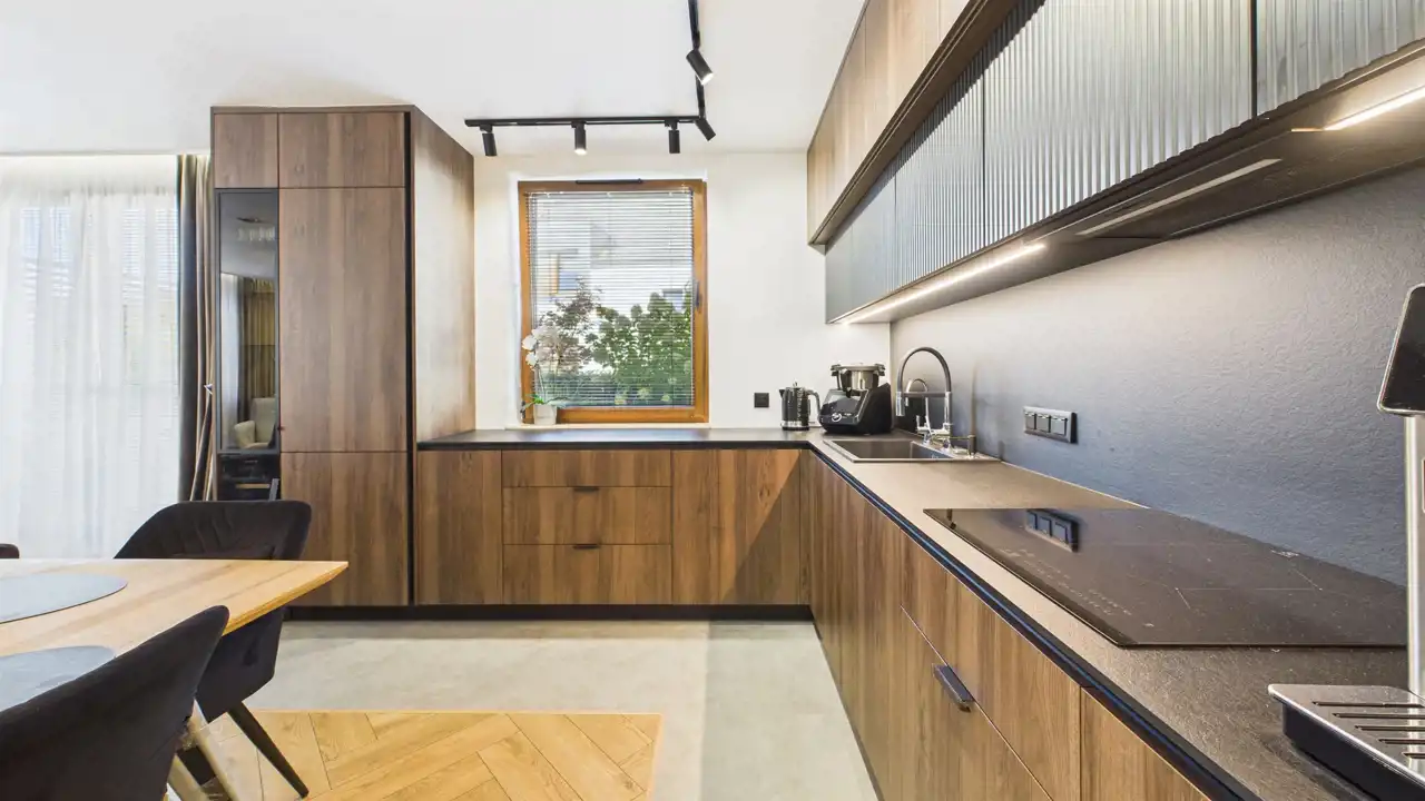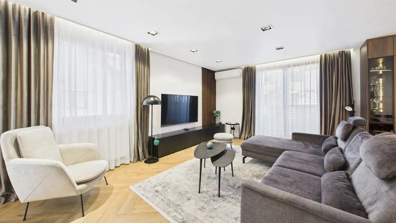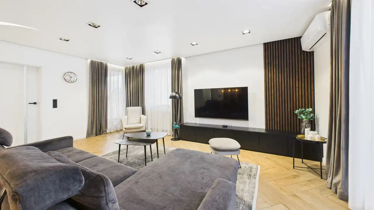 Wysoki standard: generalny remont 2 lata temu, meble na wymiar, klimatyzacja, sprzęty AGD w zabudowie (płyta indukcyjna, zmywarka, lodówka, lodówka na wino), drewniane podłogi- jodełka, duża kanapa z elektryczną funkcją rozkładania, Duży TV na ścianie, oświetlenie punktowe i LED, rolety plisy i moskitiery w oknach.