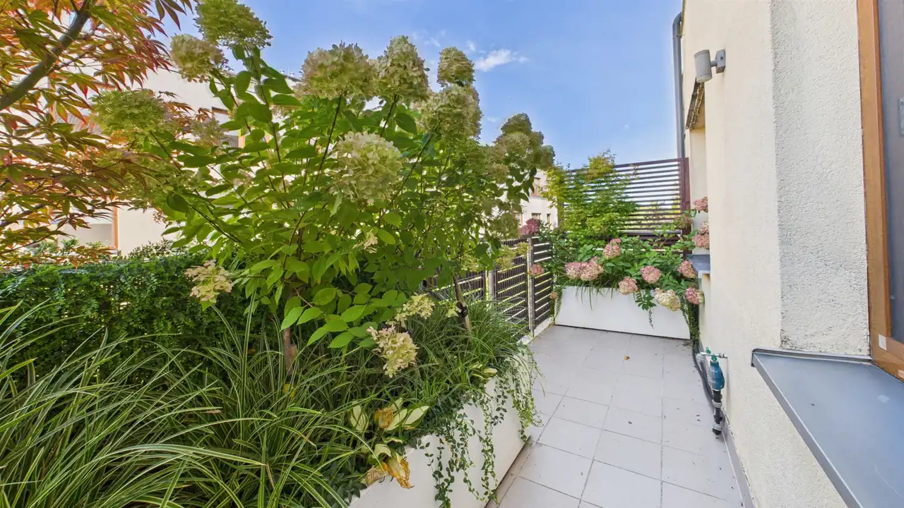 Dwa balkony, łącznie ponad 22 m² – jeden z salonu, drugi z sypialni i salonu. Z balkonu można mieć oko na dzieci bawiące się na placu zabaw znajdującym się na zamkniętym terenie osiedla.