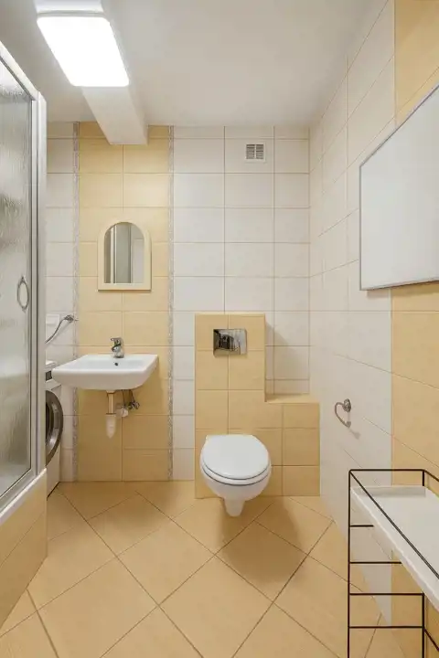 - Łazienka z WC, z kabiną prysznicową i pralką