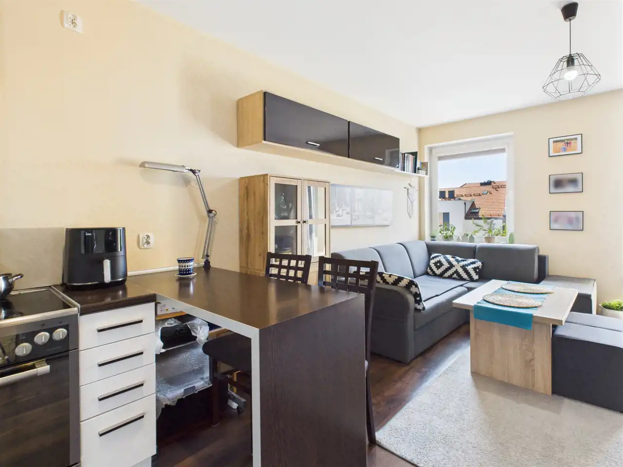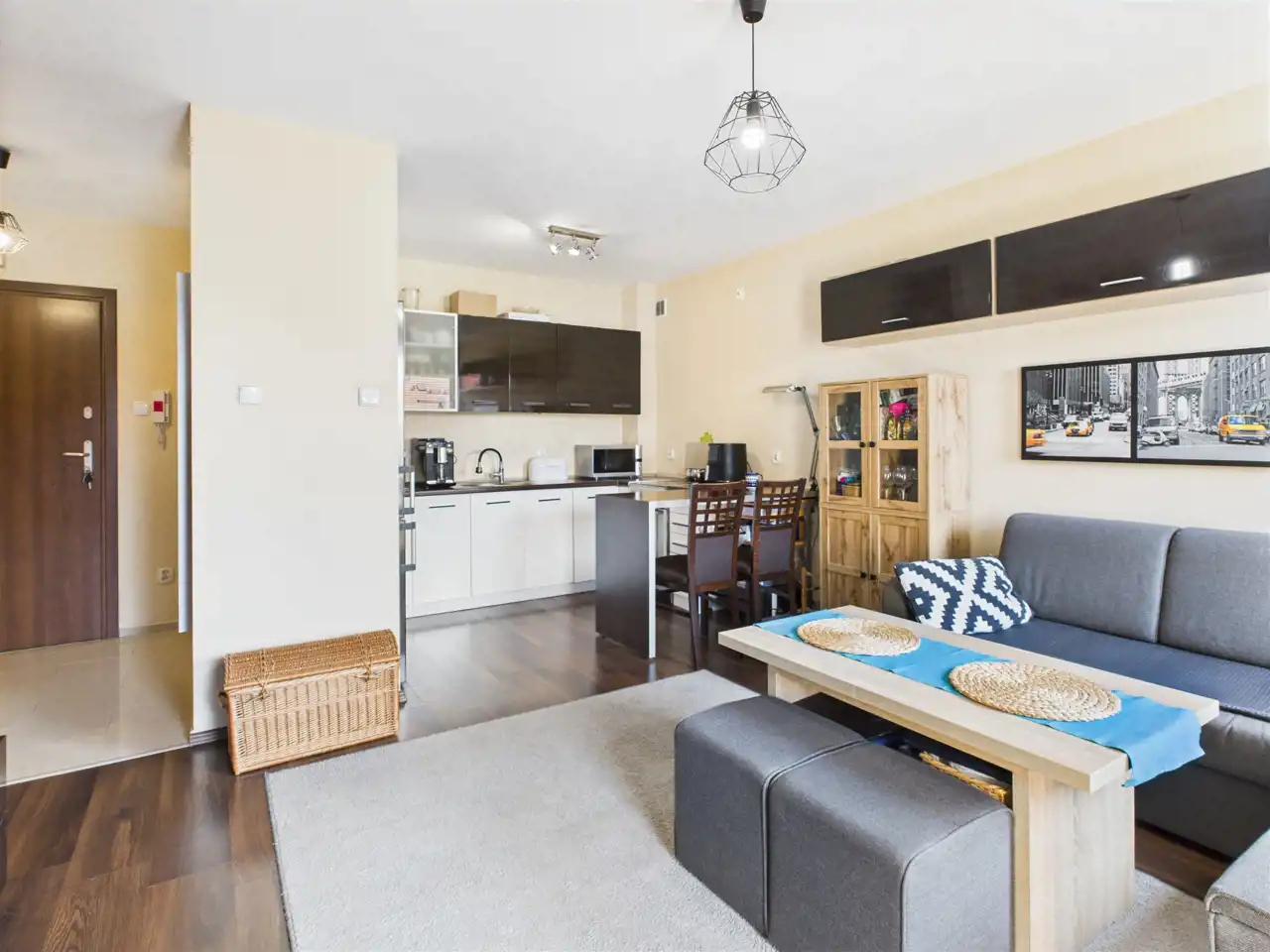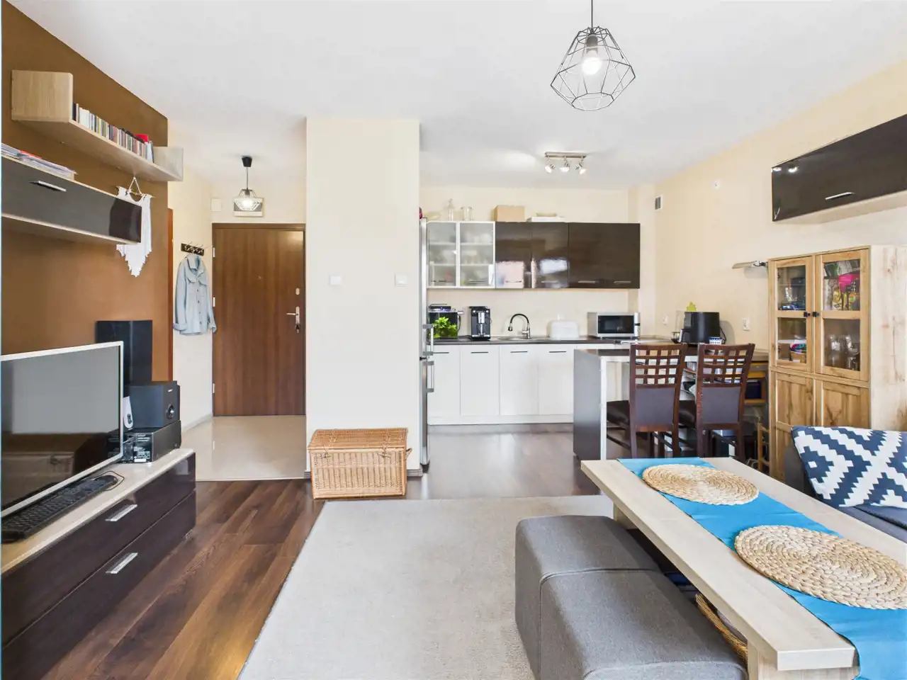 - Salon z aneksem kuchennym i wyjściem na balkon,