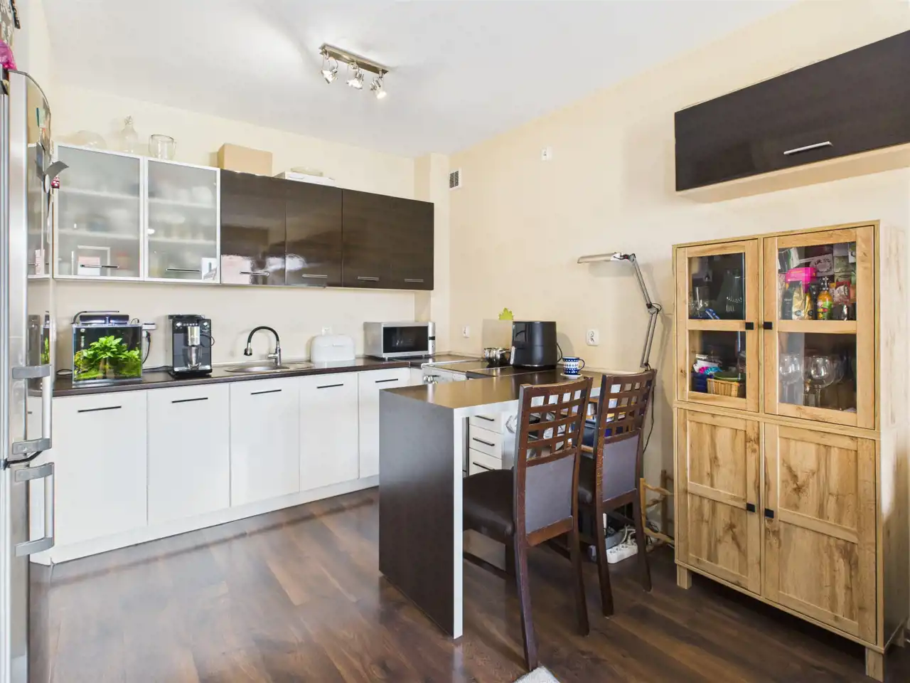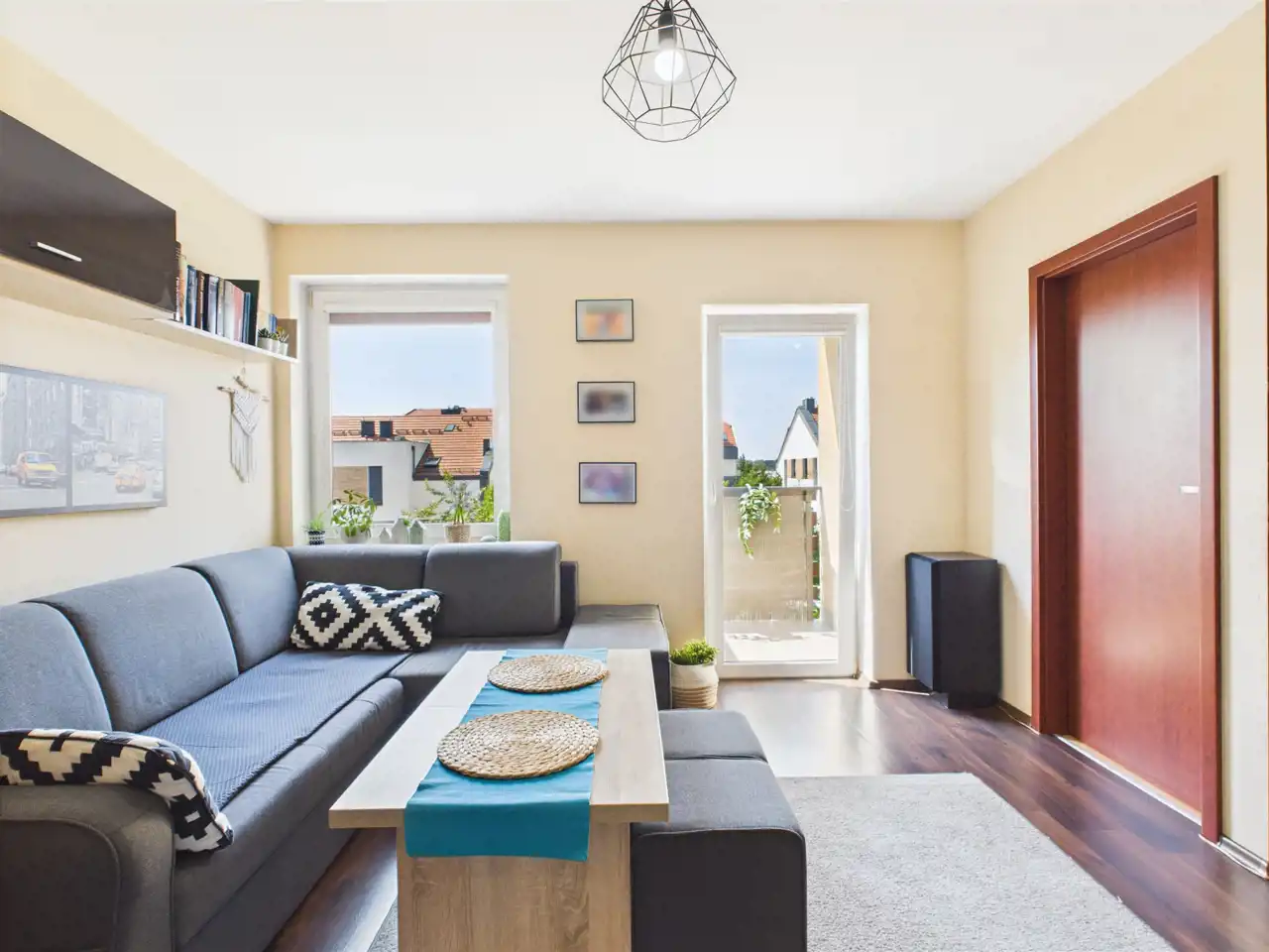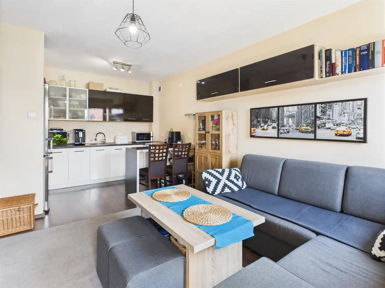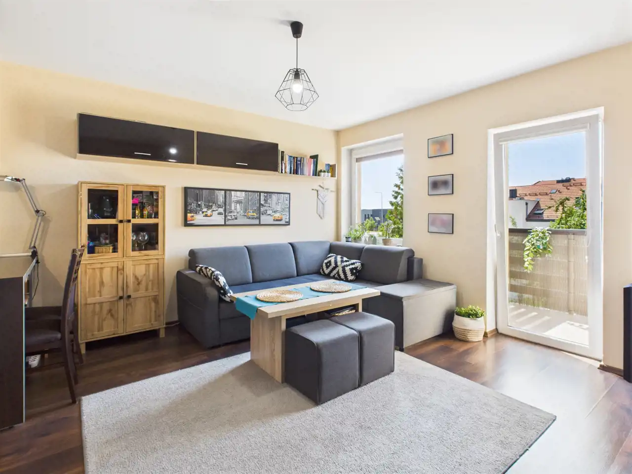 - Salon z aneksem kuchennym i wyjściem na balkon,