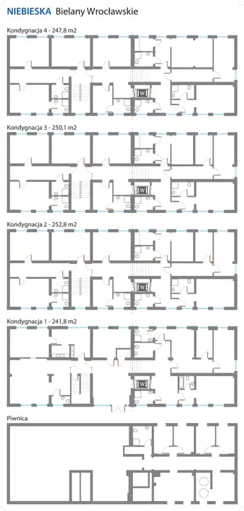 Łącznie 4 pokoje mieszkalne z mniejszymi oknami od standardowych i bez łazienek na poziomie -1, 18 apartamentów mieszkalnych z łazienkami i 14 pokoi mieszkalnych na pozostałych kondygnacjach.