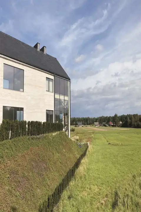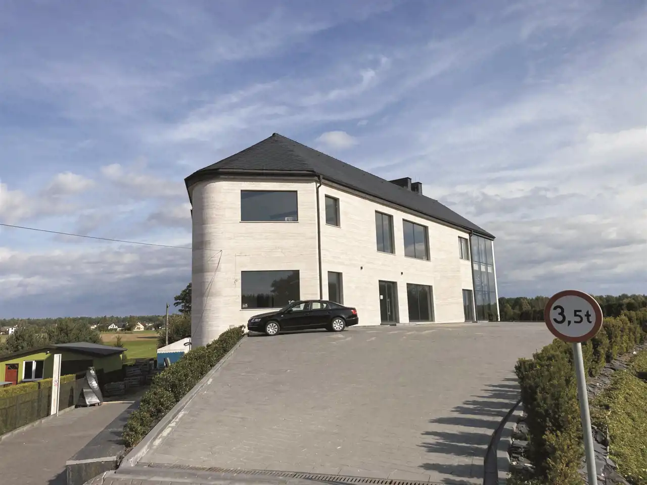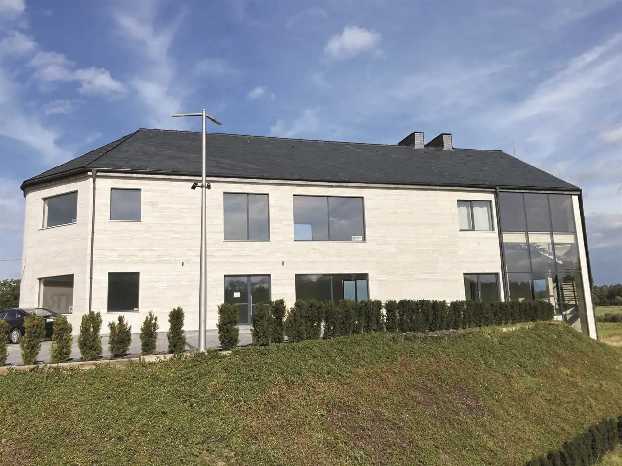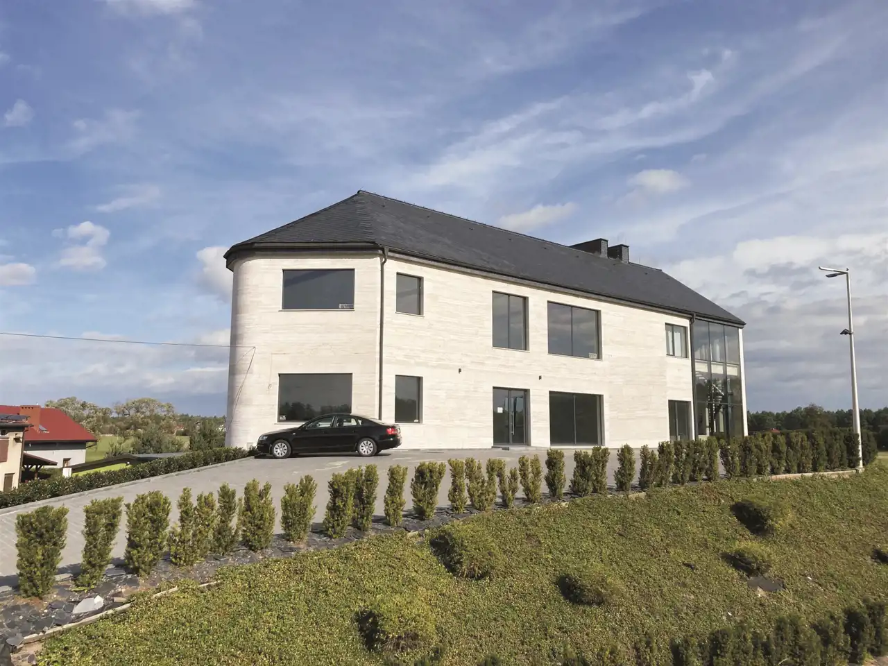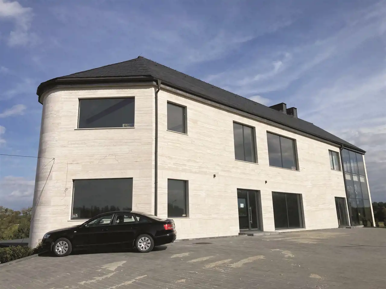 Elewacja wyłożona włoskim trawertynem i dach przykryty hiszpańskim łupkiem nadają budynkowi ekskluzywny charakter.