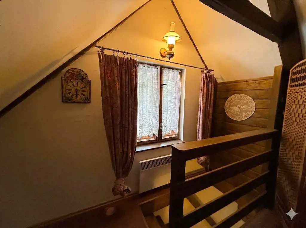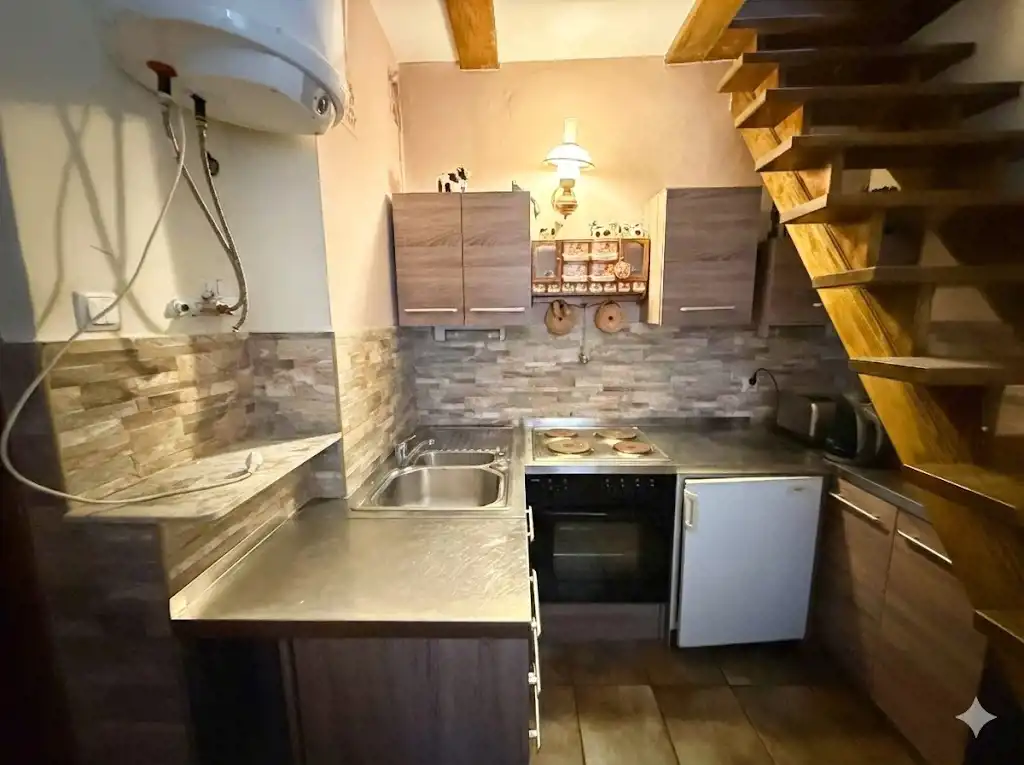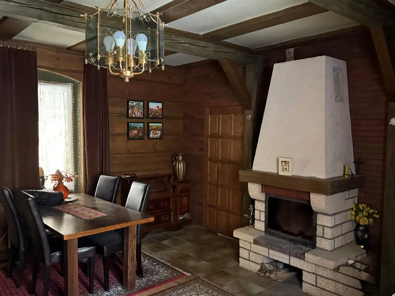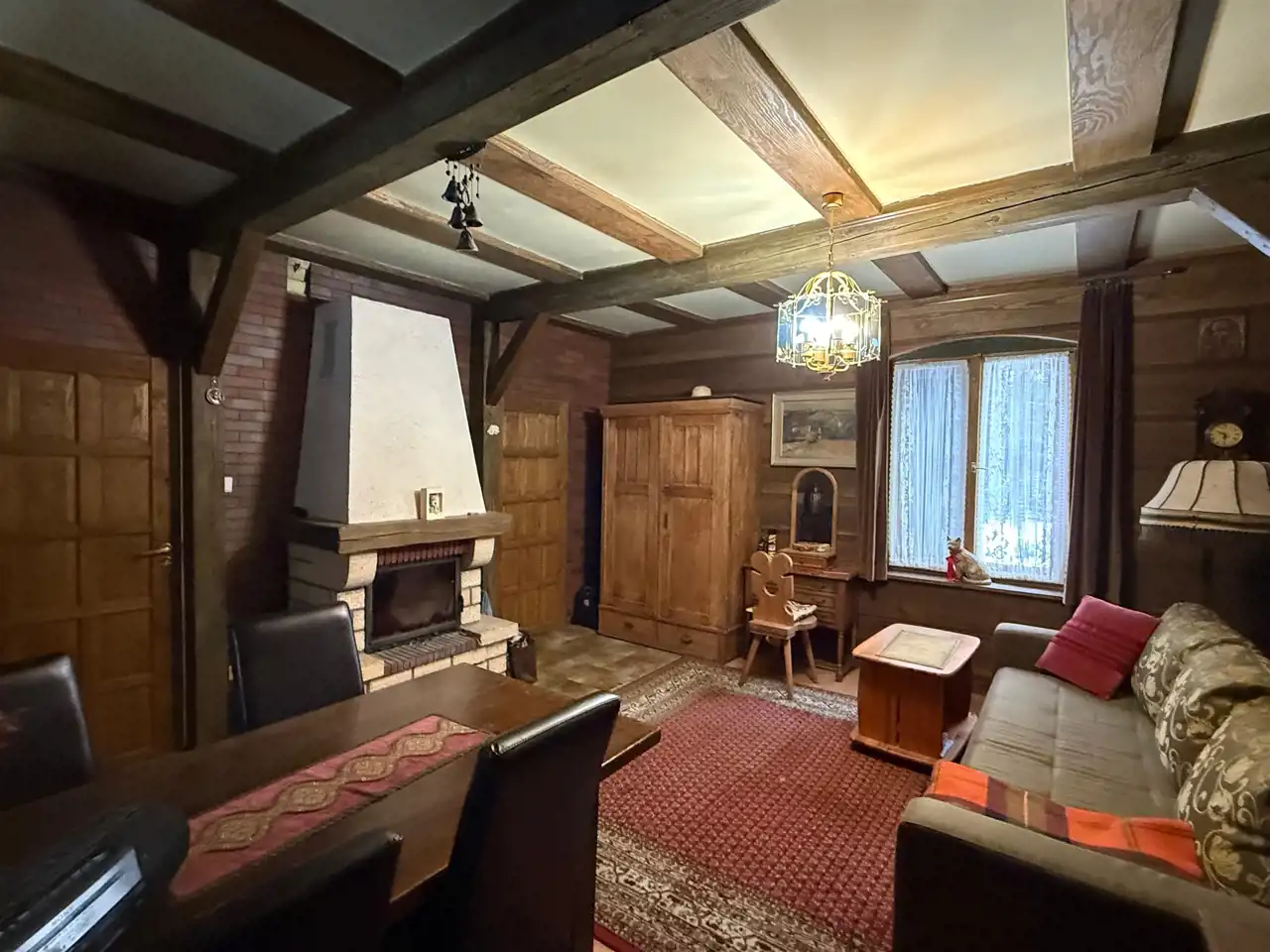 - Parter (ok. 30 m²): przytulny salon z klimatycznym kominkiem, kuchnia oraz łazienka