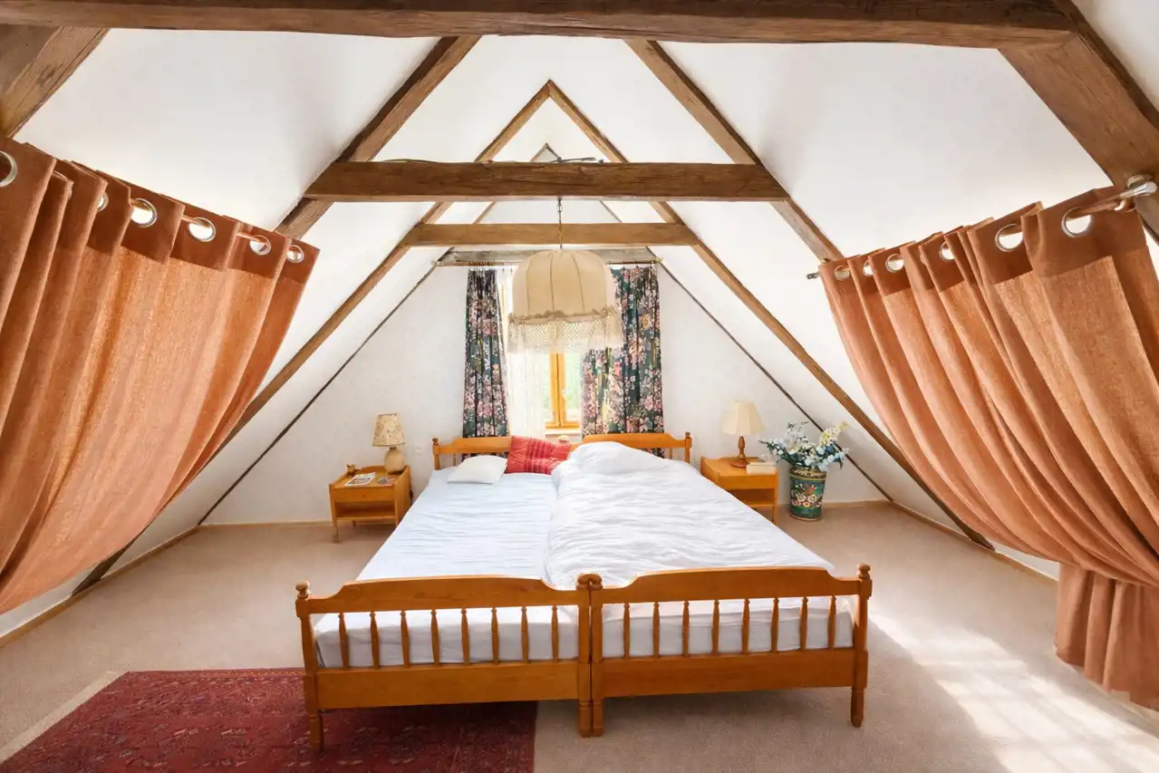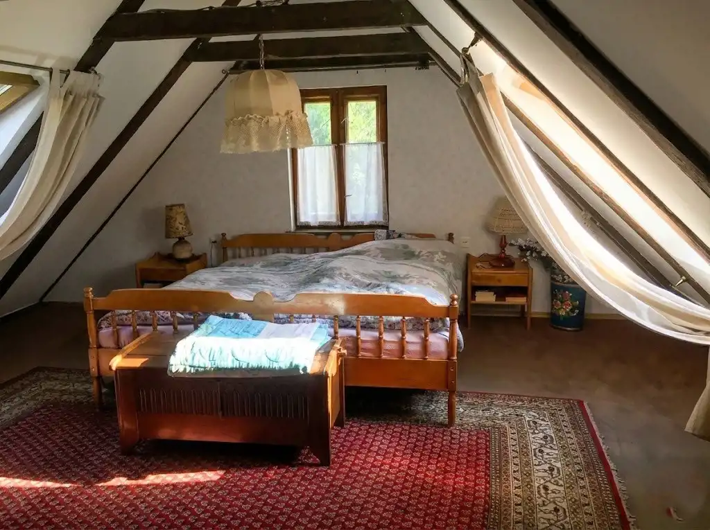 - Poddasze użytkowe (ok. 38 m² po podłodze): przestronna sypialnia ze skosami.