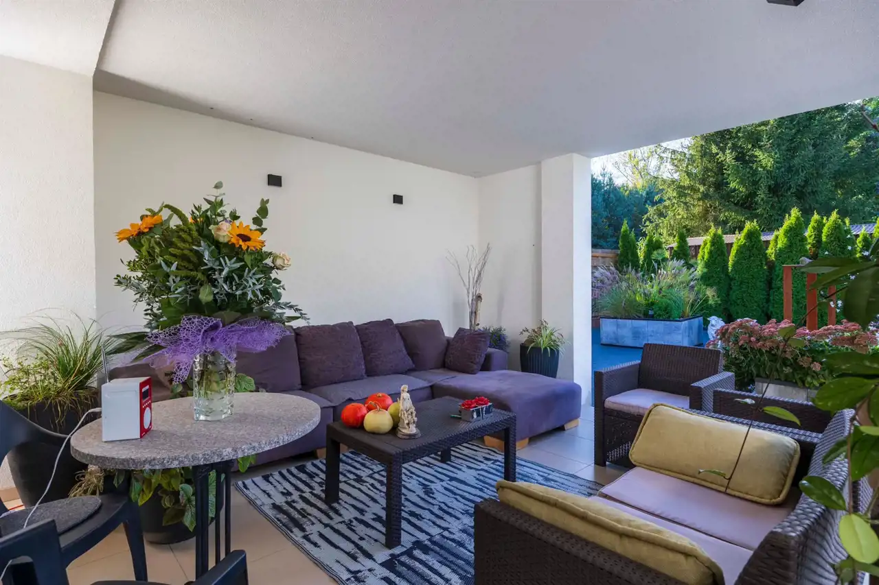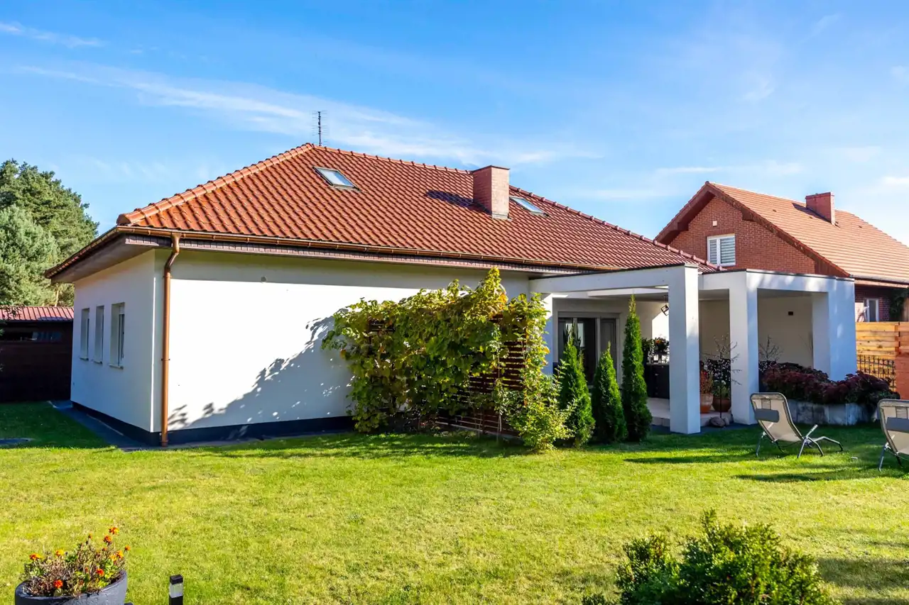 Na posesji oprócz domu znajduje się również drewniany budynek gospodarczy, idealny na narzędzia i sprzęt ogrodniczy. Ścieżki oraz podjazd wyłożono kostką brukową. Za domem rozciąga się starannie zaprojektowany ogród z przestronnym, zadbanym tarasem – doskonałym miejscem do relaksu wśród zieleni i śpiewu ptaków.