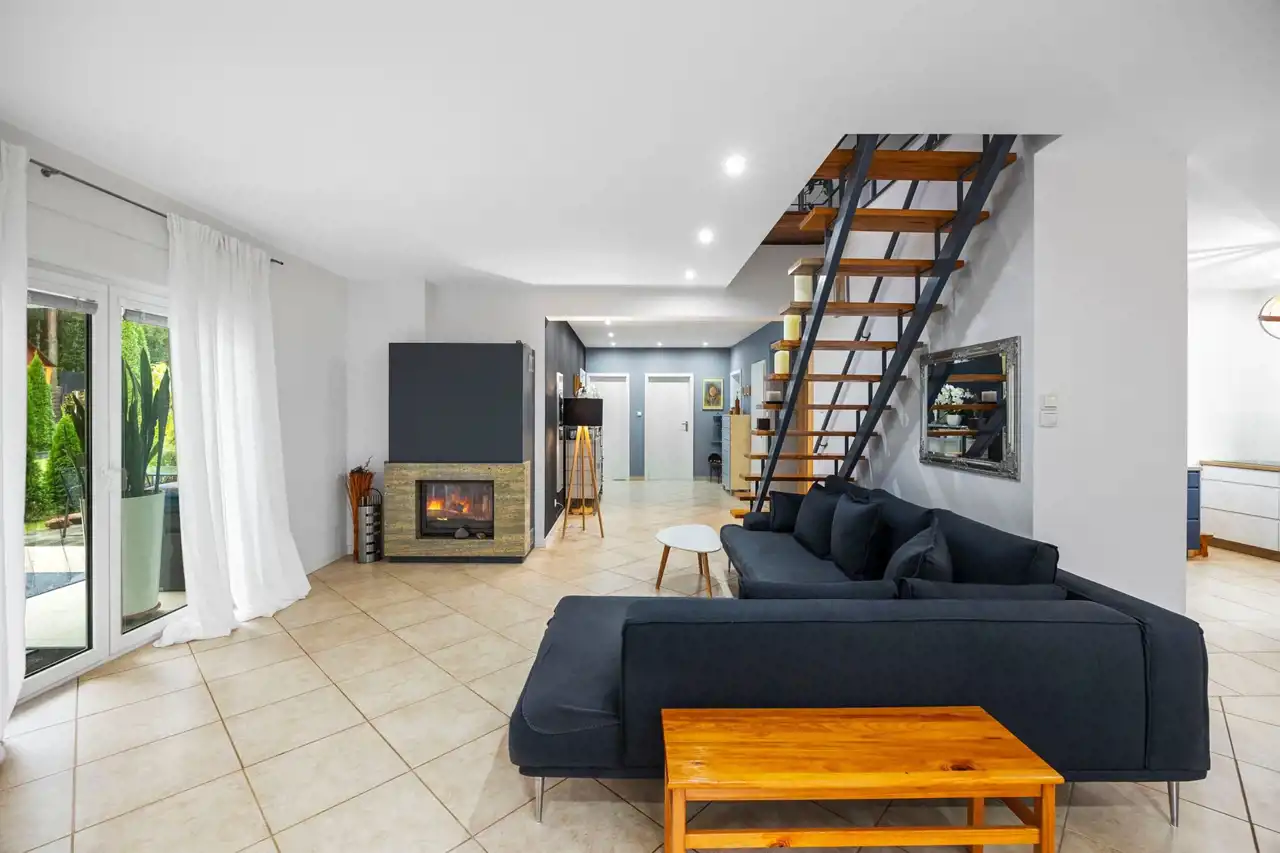 - salon z kominkiem (28,4 m²) i wyjściem na taras,