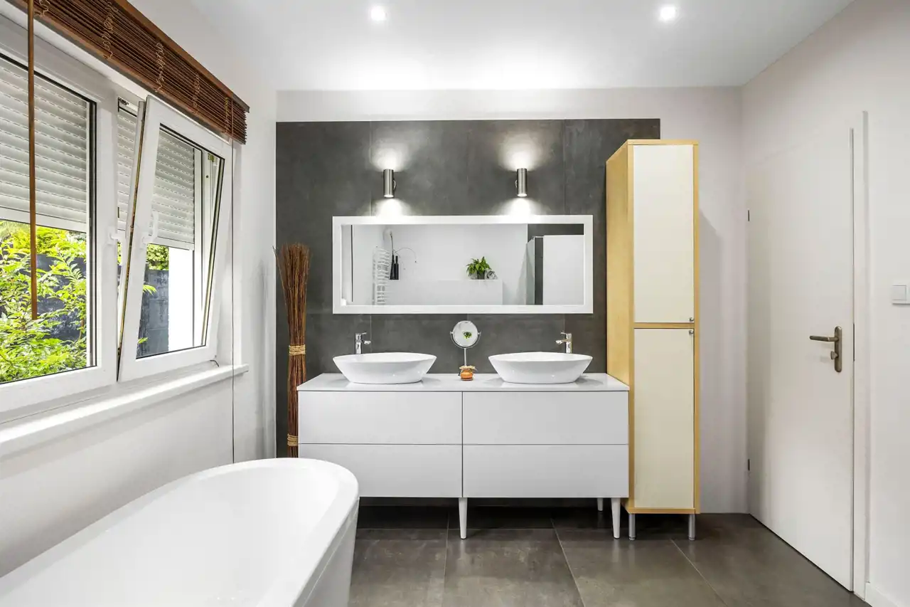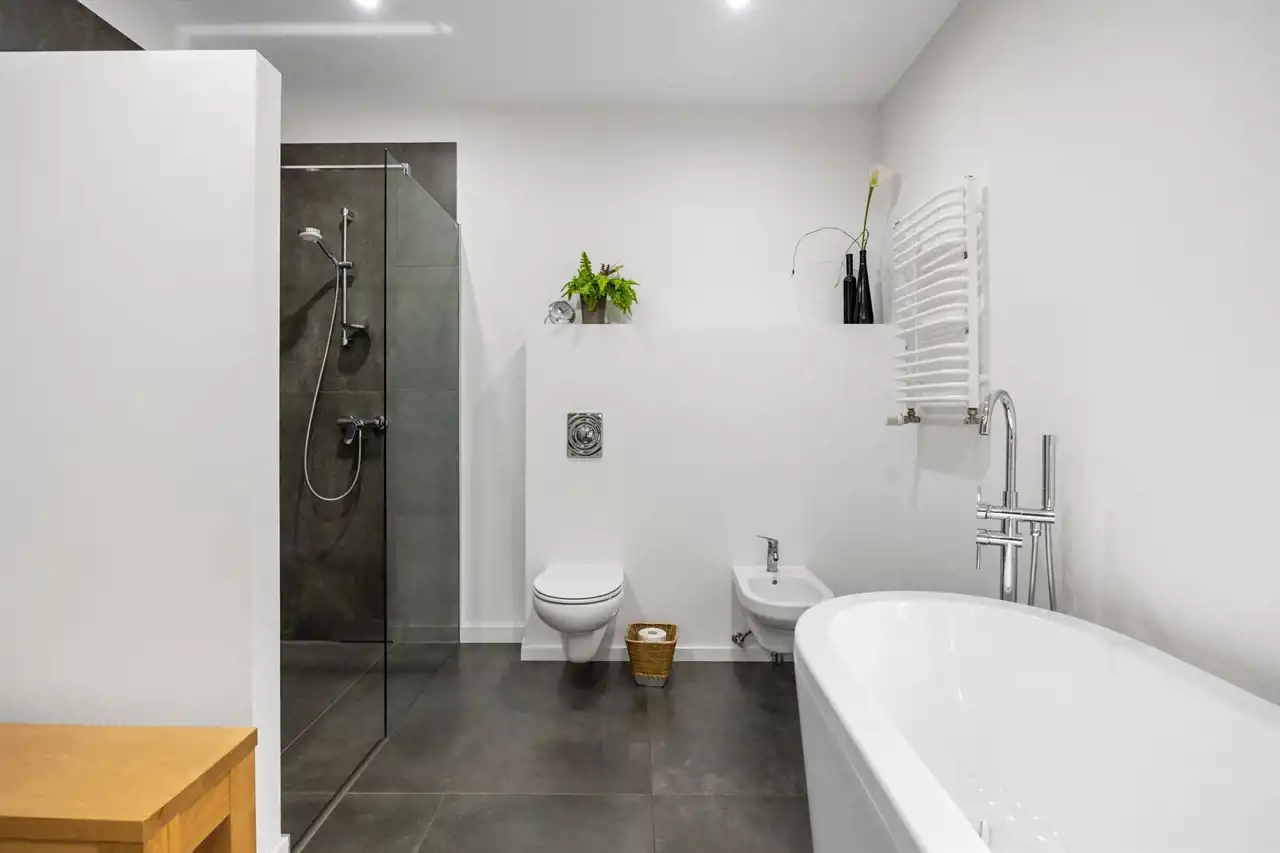 - łazienka (11,3 m²) z wanną, prysznicem, WC, bidetem i umywalką,