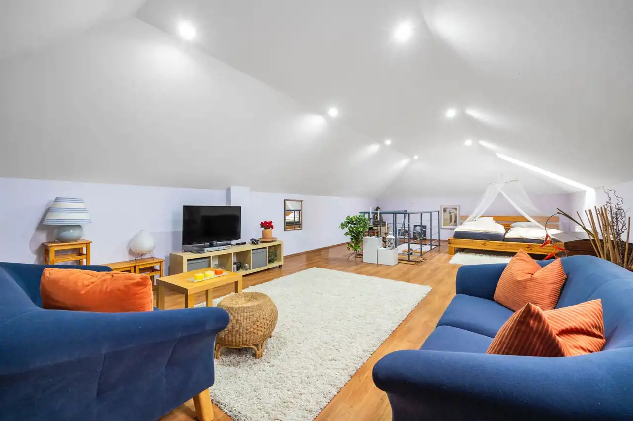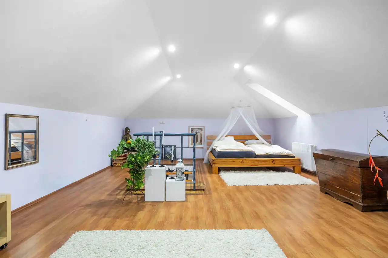 - otwarta przestrzeń o powierzchni ok. 55 m² z dodatkową przestrzenią do przechowywania( pod skosami)