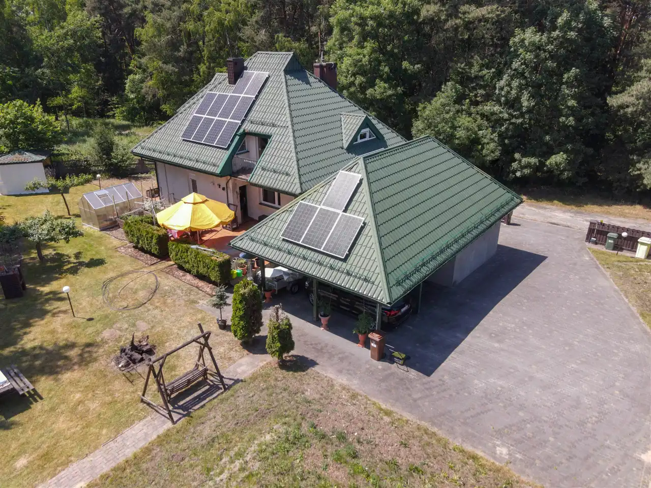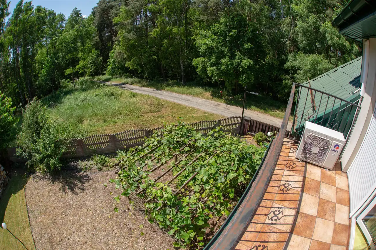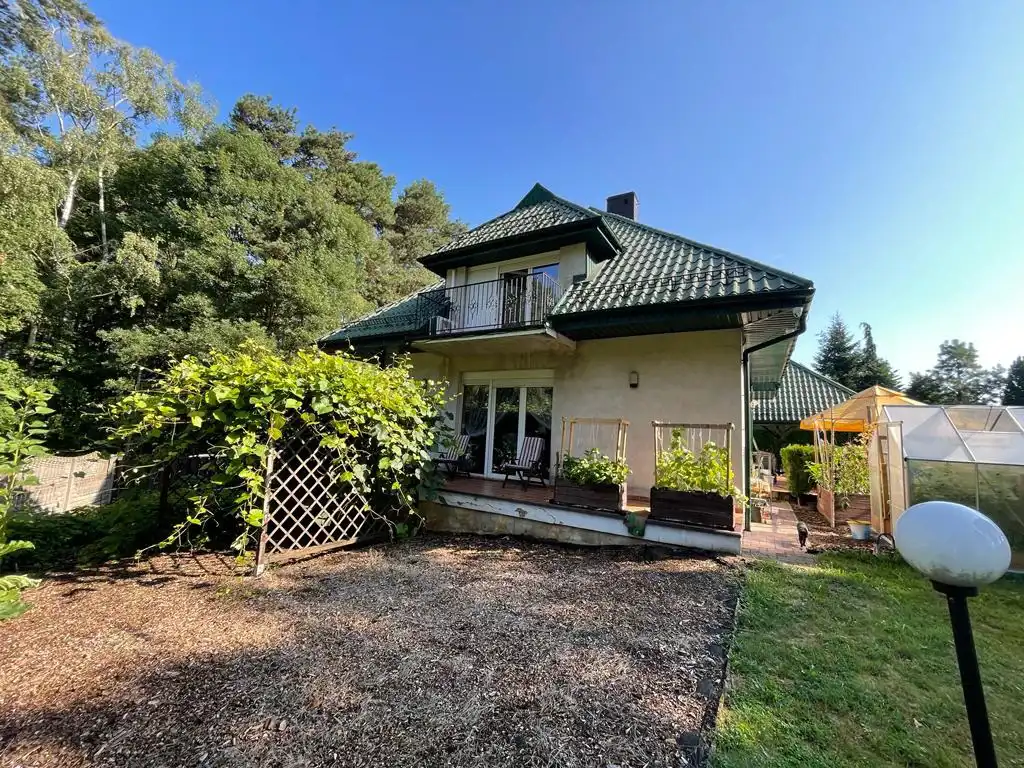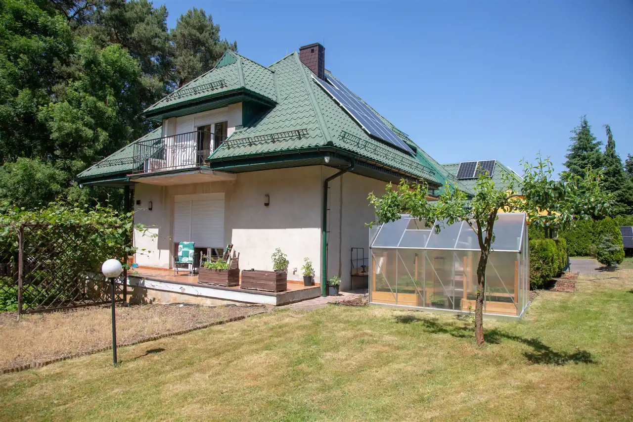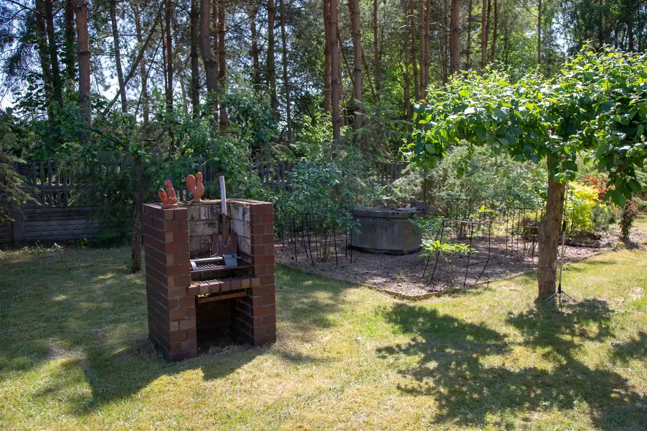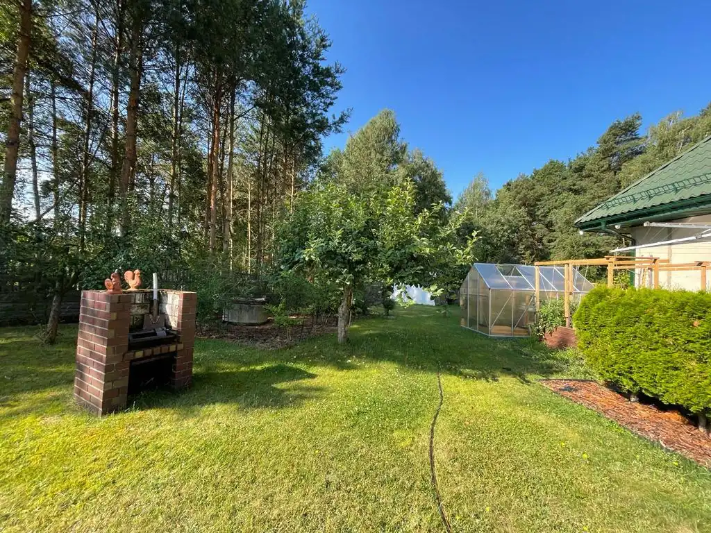 Działka o powierzchni 1479 m2 ogrodzona i pięknie zagospodarowana. Na dużym tarasie możemy relaksować się w ciszy i spokoju. Dodatkowo na działce znajduje się murowany grill, szklarnia oraz dwie wiaty metalowe pokryte blachodachówką.