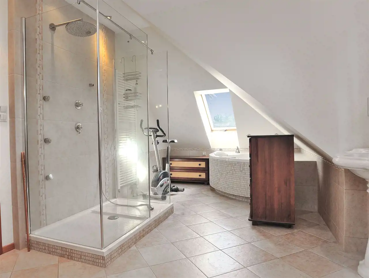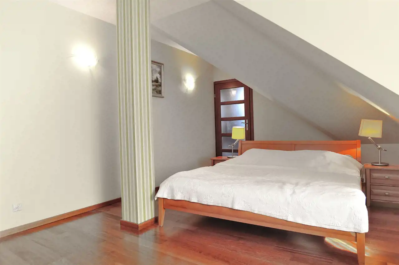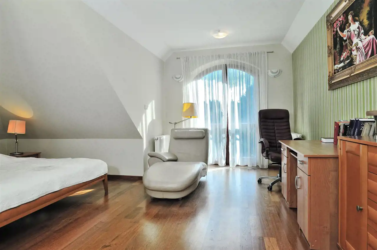 Na piętrze : dwa pokoje w tym jeden z osobną garderobą , salon łazienkowy.