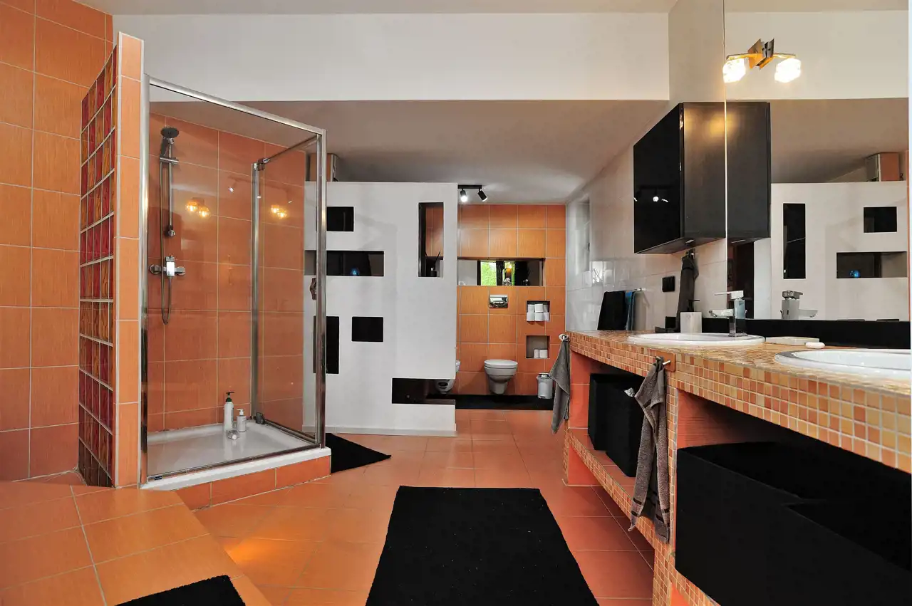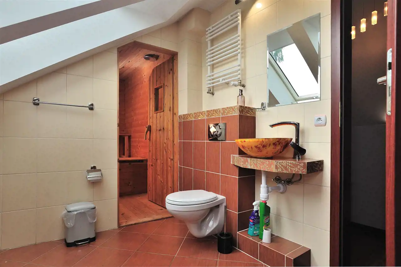komfortowy salon kąpielowy z wanną, prysznicem i WC,
