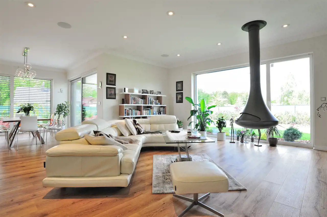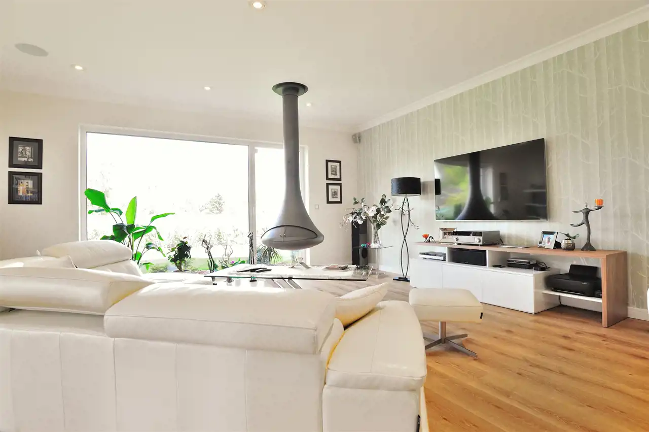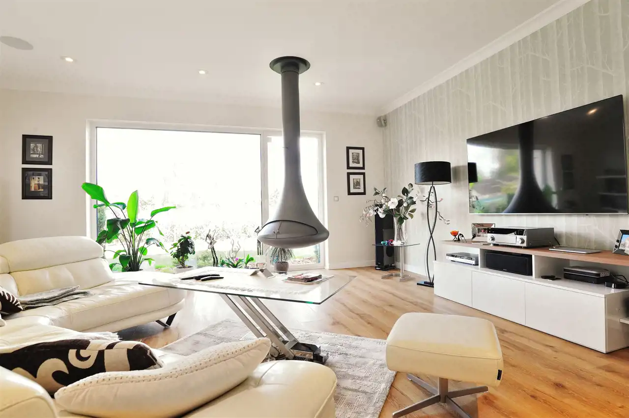 W salonie kominek wiszący - Stroger.