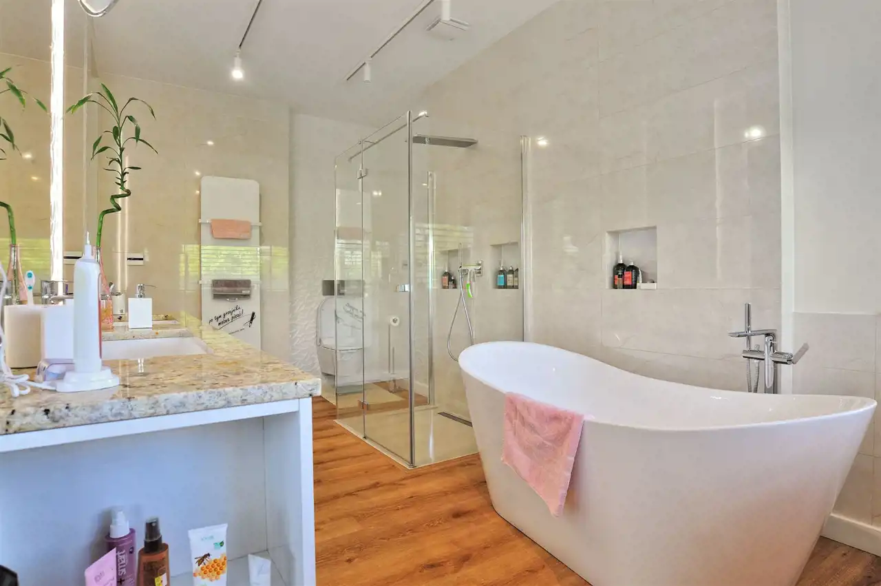 Łazienki wykończone w granicie, w łazience profesjonalne nagłośnienie.