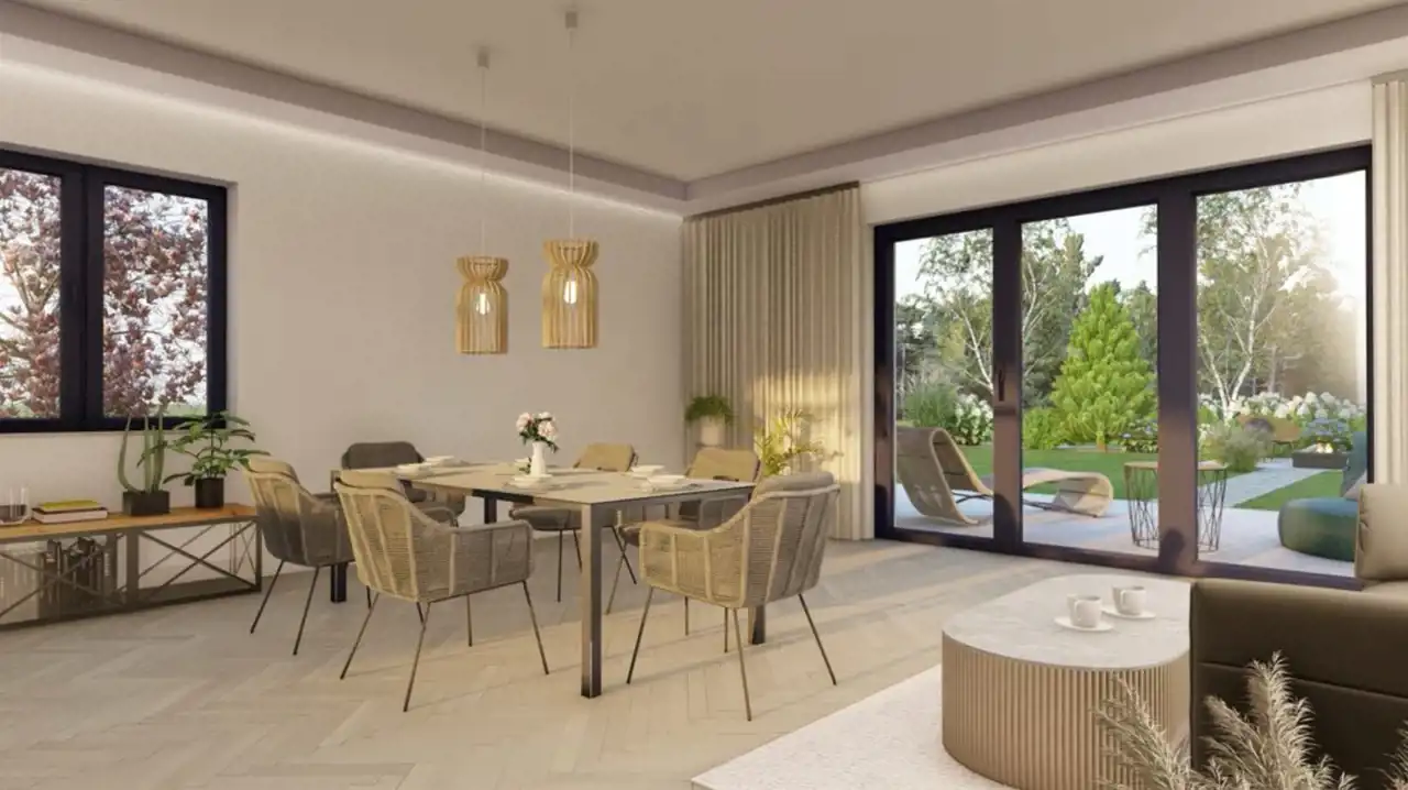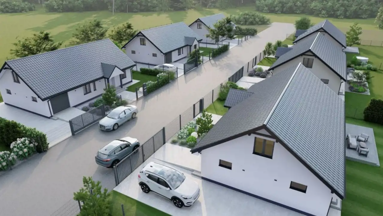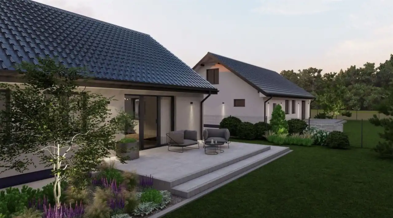 Dom wolnostojących o powierzchni użytkowej 132m2 + 100m2 składa się z 3 sypialni, salonu z aneksem kuchennym, łazienki, toalety, garażu oraz kotłowni.