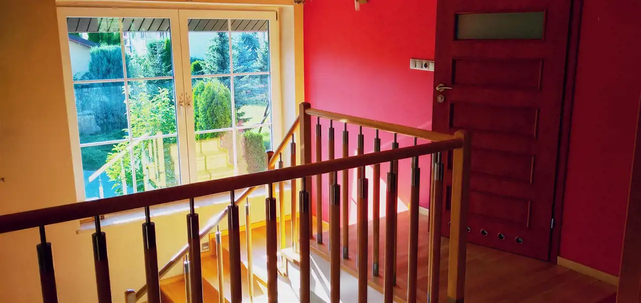 - trójbiegowa klatka schodowa z dużym oknem z widokiem na ogród