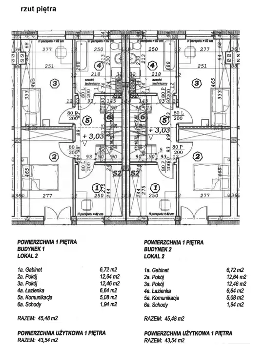 Budynki wykonane w technologii tradycyjnej: cegła ceramiczna / ocieplenie – styropian szary o grubości 20 cm/ elewacja zewnętrzna – tynk silikatowy / dach pokryty blachodachówką / balustrady balkonowe ze stali nierdzewnej /stolarka okienna PCV -okna 3-szybowe, ciepły montaż/ stolarka drzwiowa grafitowa / tynki wewnętrzne gipsowe, bez gładzi /wylewka betonowa przygotowana pod ułożenie podłogi / parapety wewnętrzne z konglomeratu i zewnętrzne -metalowe / siła w kuchni / ogrzewanie podłogowe cały parter i piętro / Media: gaz, prąd, woda miejska, kanalizacja / budynki ogrodzone / każdy segment z oddzielnym wjazdem z drogi publicznej/ miejsca postojowe wyłożone kostką / na poddasze doprowadzone media/Domy sprzedawane bez pieca gazowego. Wewnętrzne instalacje: instalacja elektryczna / instalacja wodno-kanalizacyjna / instalacja