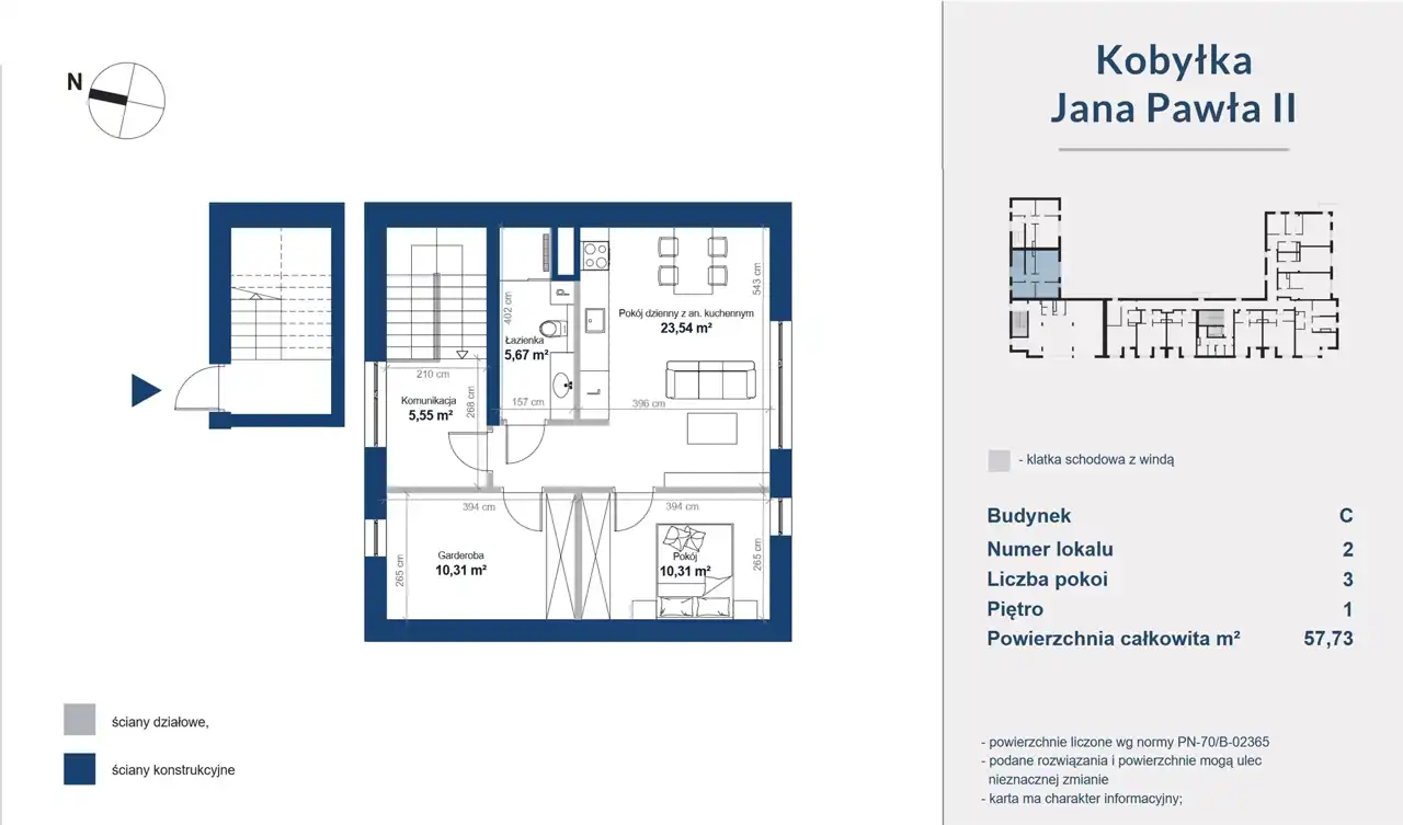 Prezentowane mieszkanie położone jest na I piętrze budynku C - lokal C2 o powierzchni całkowitej 57,73 m2.