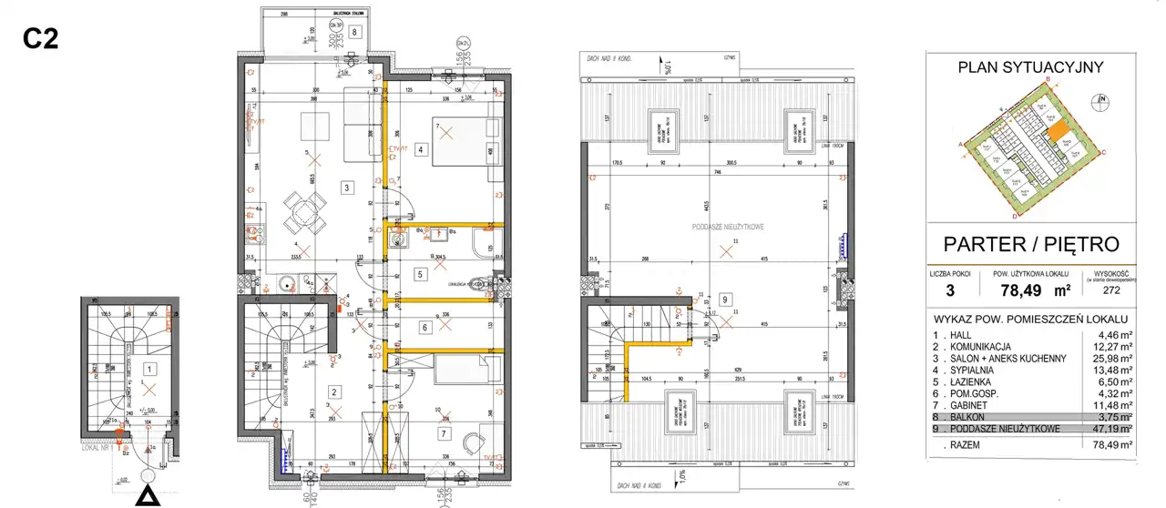 Opis szczegółowy: Mieszkanie na piętrze (lokal H2) o powierzchni całkowitej 125,68 m2 z nieużytkowym poddaszem, powierzchni użytkowej 78,49 m2.