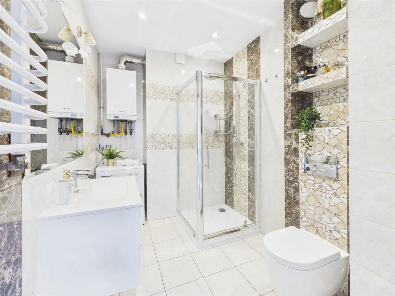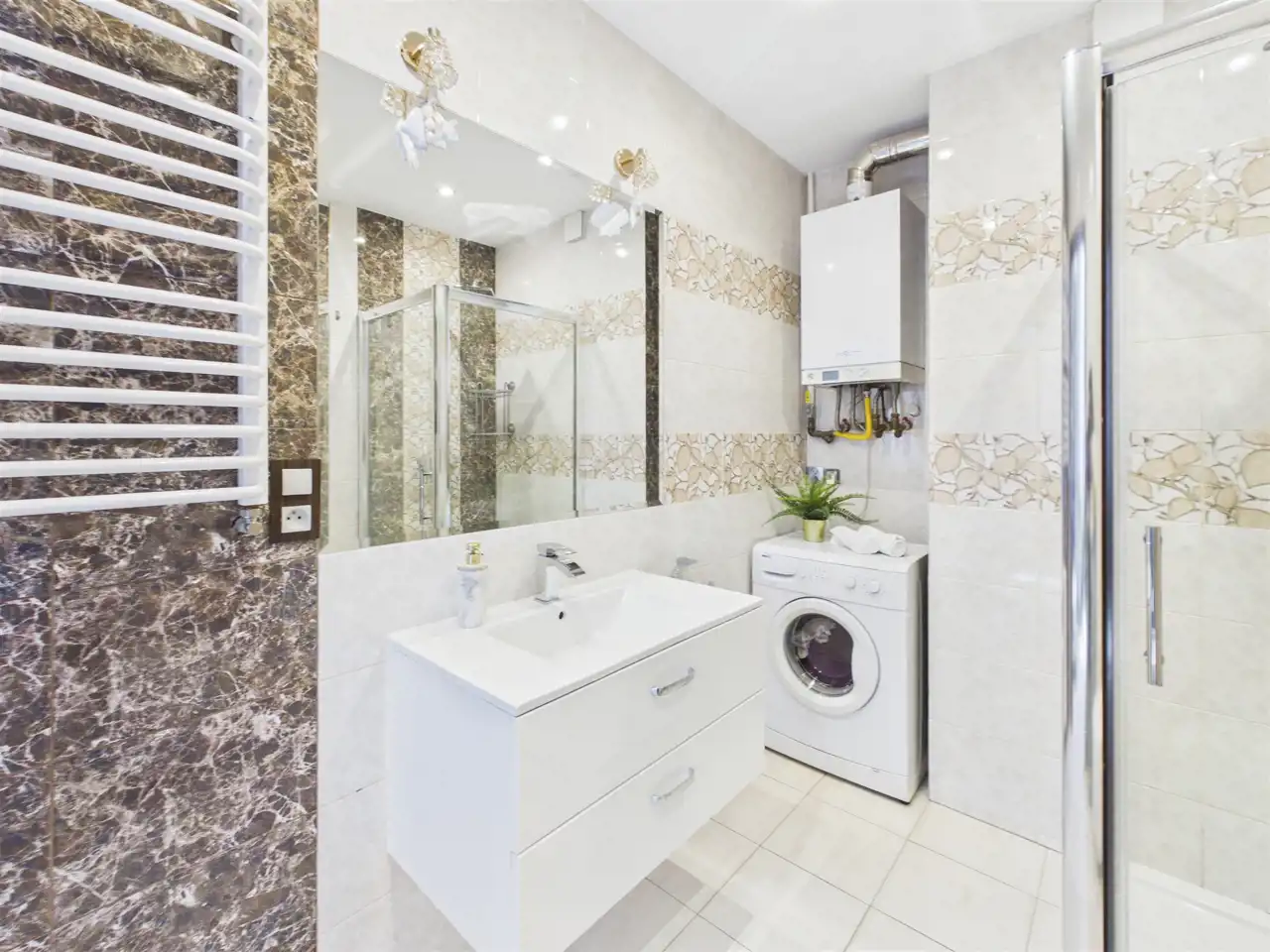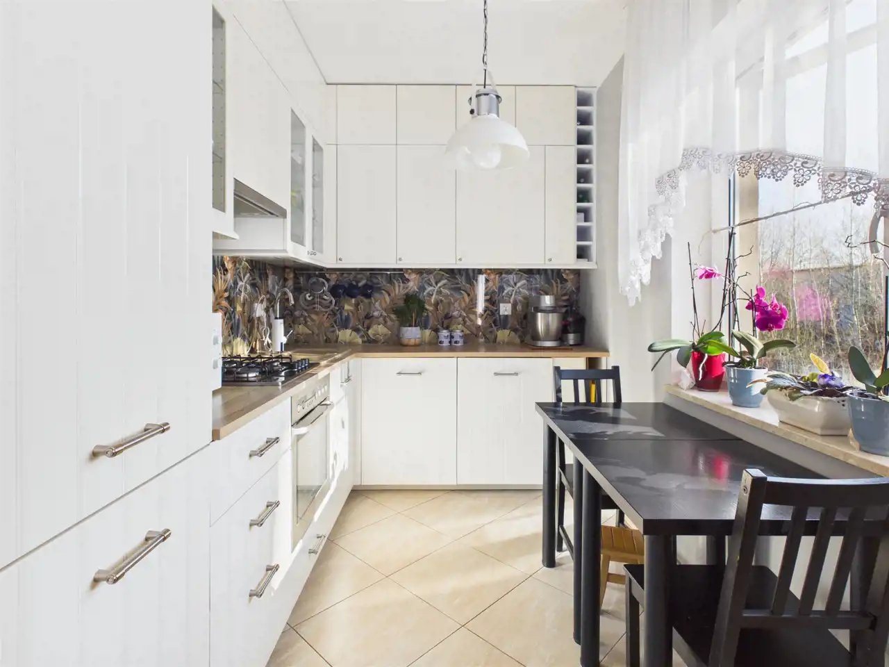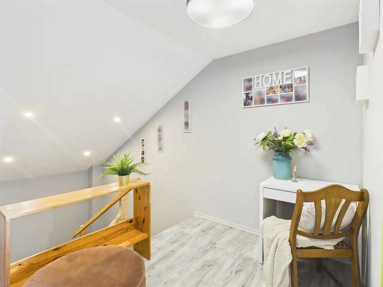 Niewątpliwą zaletą jest rozkład mieszkania – górna kondygnacja może pełnić funkcję prywatnej strefy sypialnianej, gabinetu do pracy zdalnej lub oddzielnej części mieszkalnej. Lokal jest wygodny i zadbany, a w łazienkach oraz kuchni zastosowano ogrzewanie podłogowe.