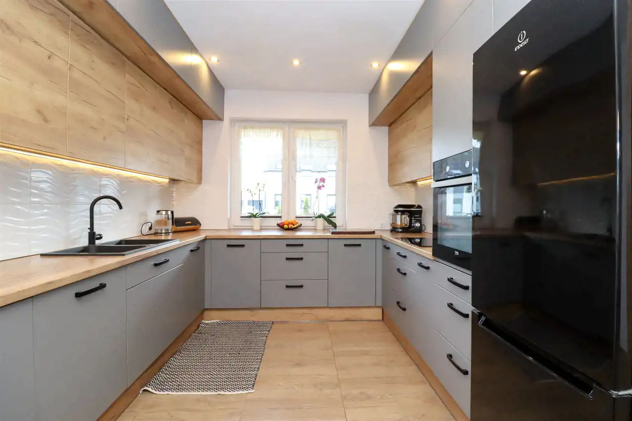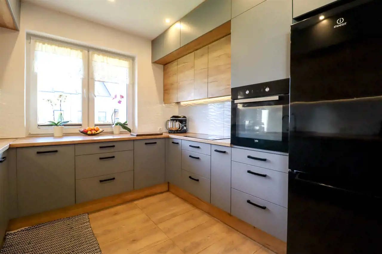 - kuchnia wyposażona sprzętem AGD tj.: lodówko – zamrażarka, zmywarka, piekarnik elektryczna, płyta indukcyjna,