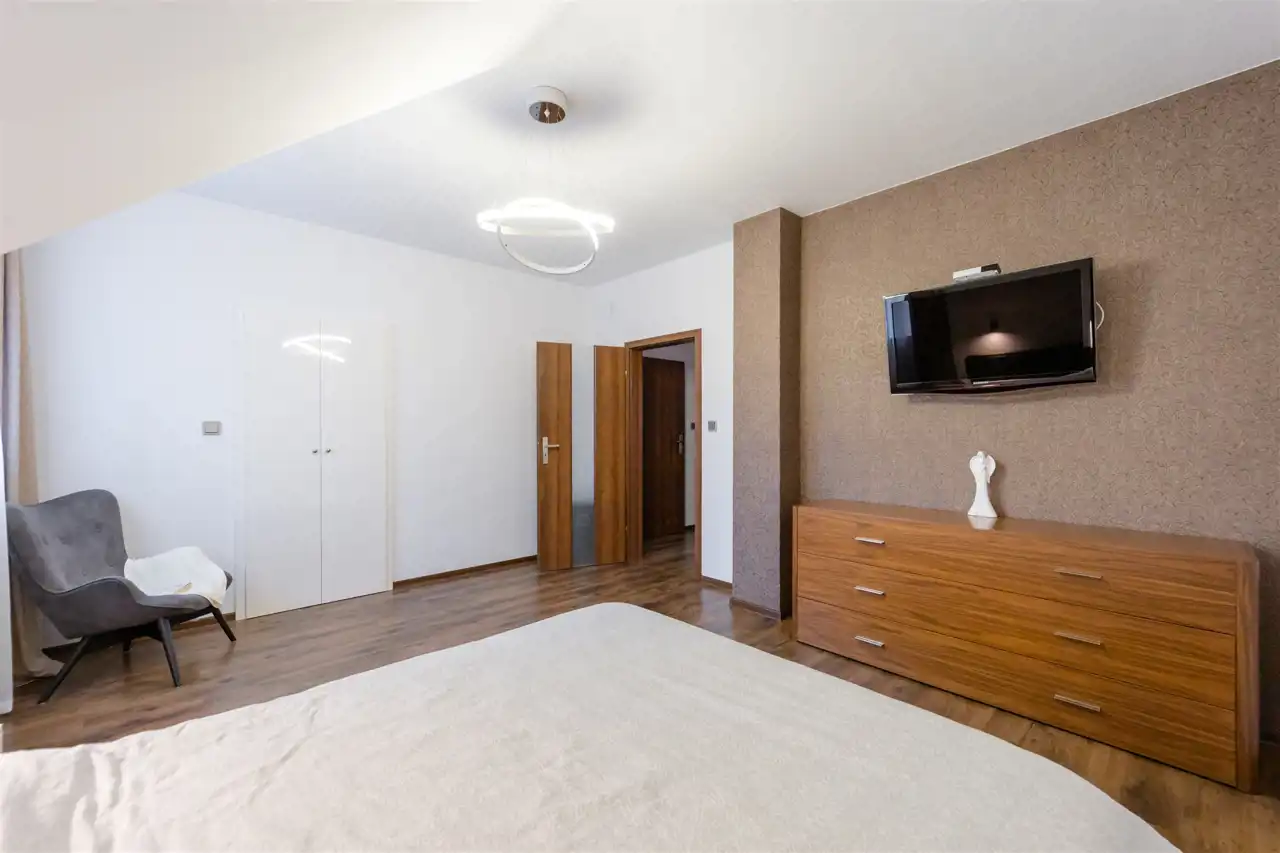 Poddasze: duża sypialnia z garderobą, sypialnia z balkonem, gabinet oraz łazienka z wanną i prysznicem.