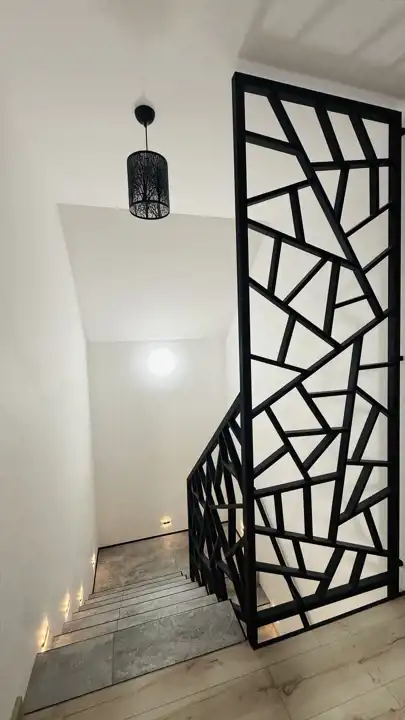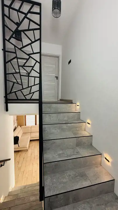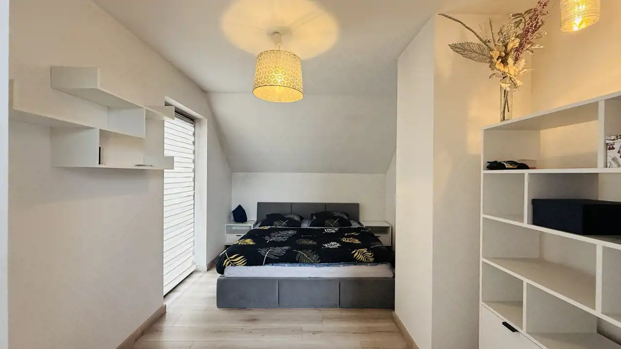 Dom wyróżnia się nowoczesną bryłą i dużymi przeszkleniami, które zapewniają doskonałe doświetlenie wnętrz oraz poczucie przestrzeni. To idealna propozycja dla rodziny szukającej komfortowego, funkcjonalnego domu z wyraźnym podziałem na strefę dzienną i prywatną.