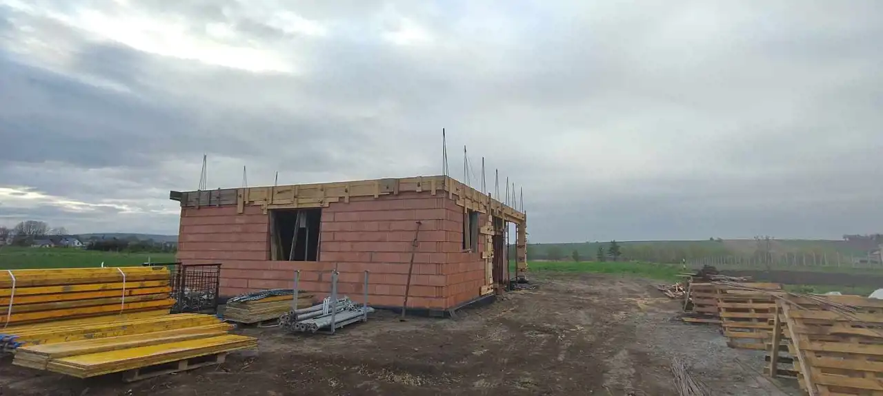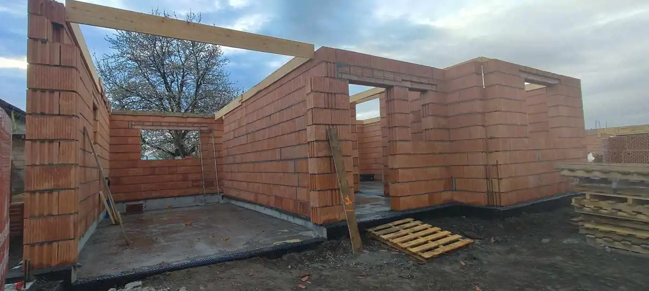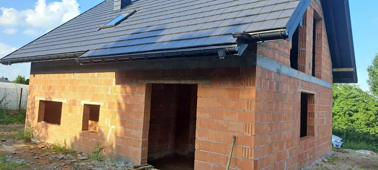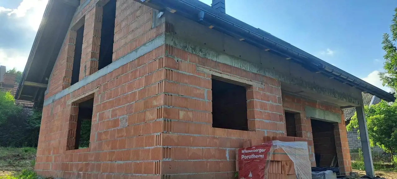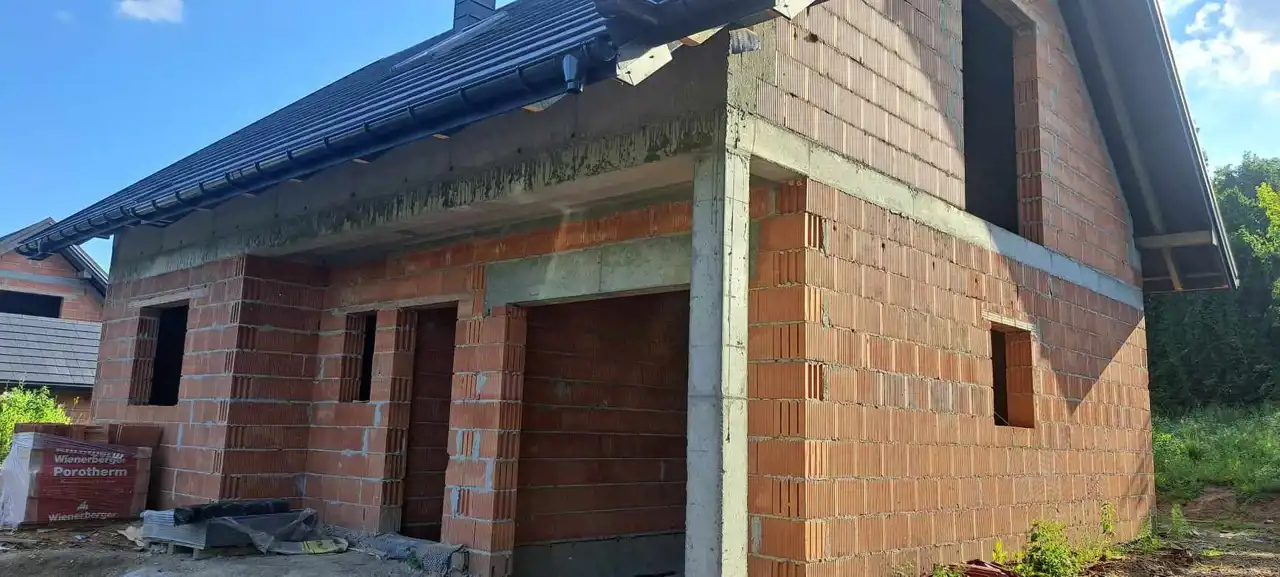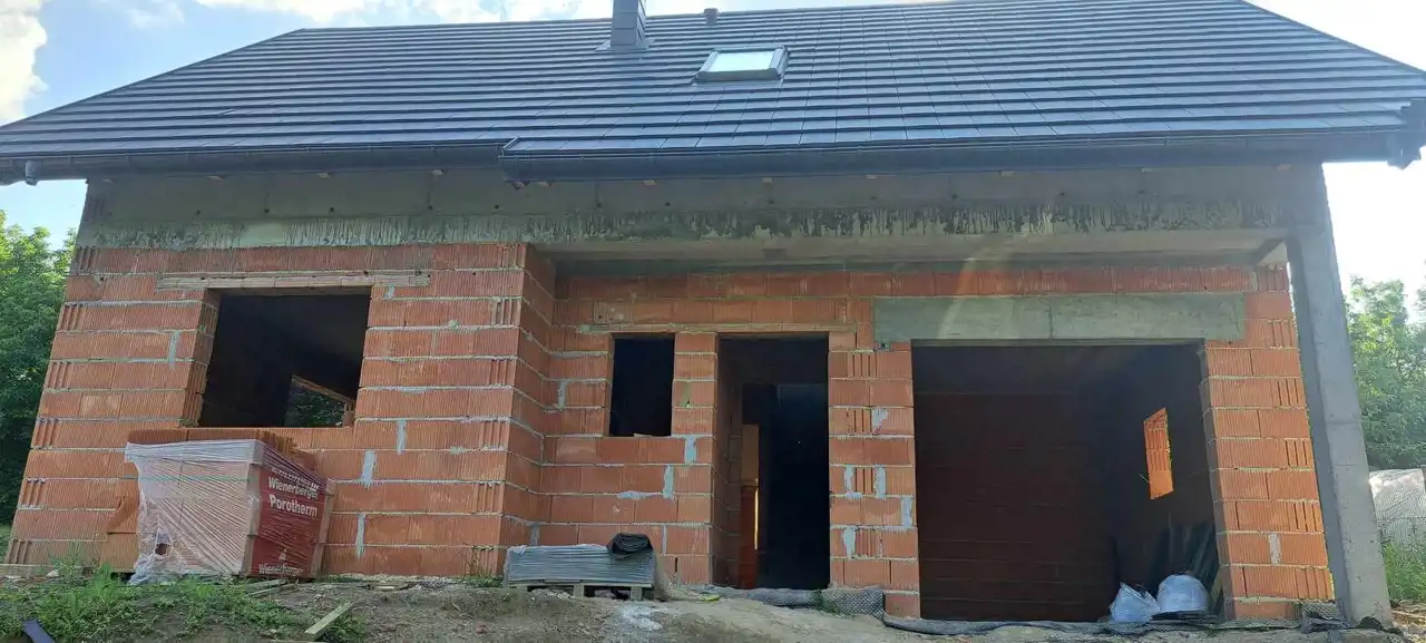 Dom jest sprzedawany w stanie surowym otwartym, budowany w technologii tradycyjnej murowanej z ceramiki, kryty dachówką, wg projektu TOMIR. Garaż w bryle budynku. Dojazd droga asfaltowa gminna, ostatni odcinek droga utwardzona.