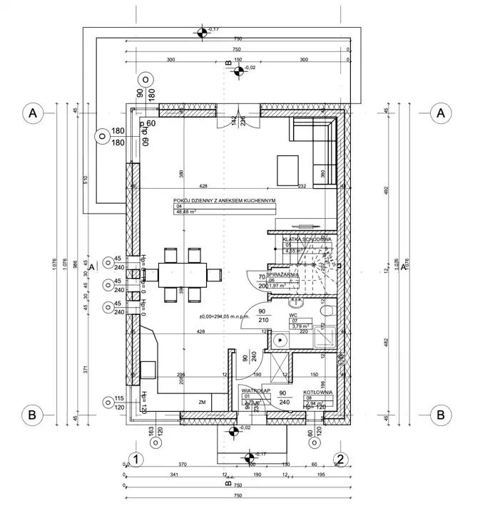 - parter: salon z aneksem kuchennym o pow. 48 m.kw., wiatrołap, łazienka, kotłownia, klatka schodowa;