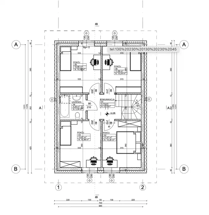 - poddasze: 3 pokoje (z możliwością wydzielenia 4), łazienka, komunikacja, wyłaz na strych.
