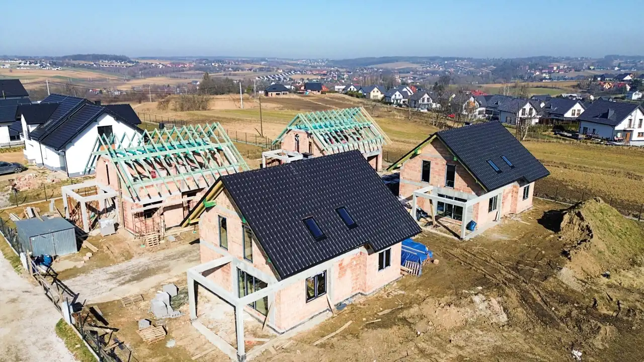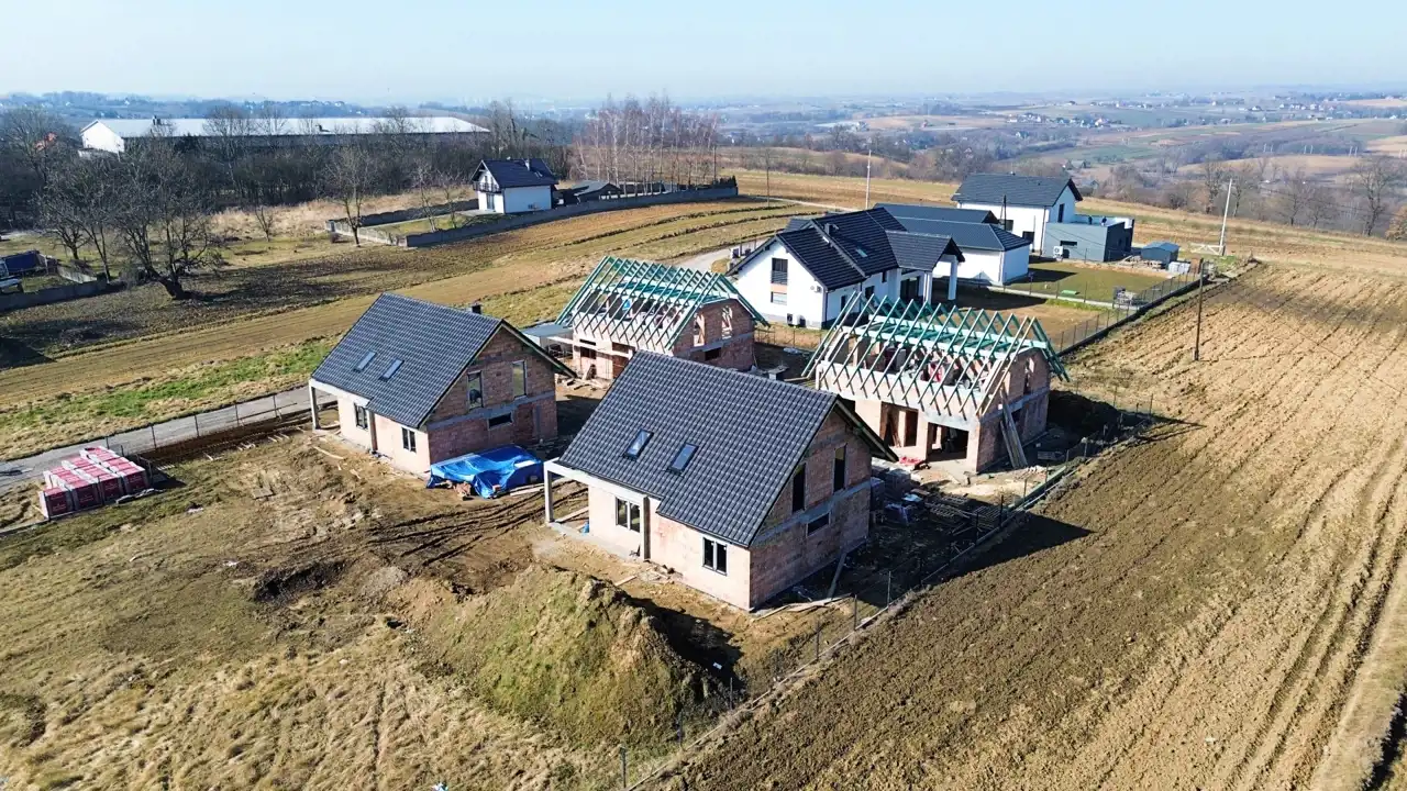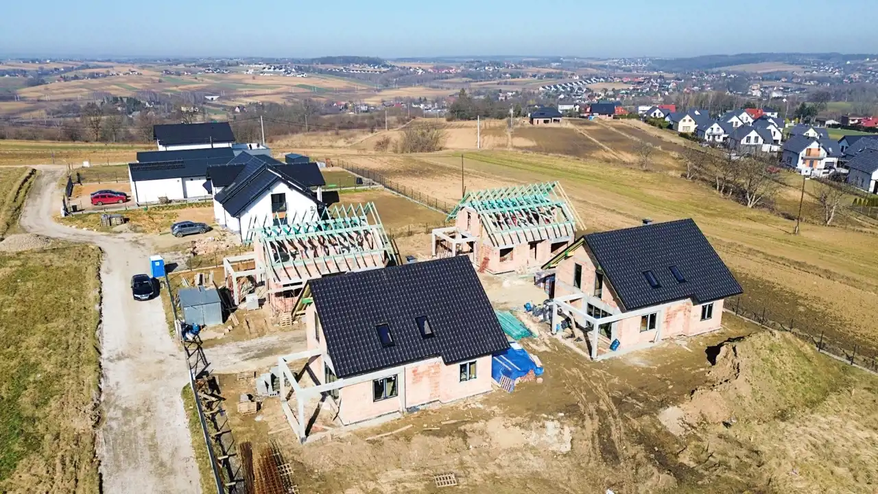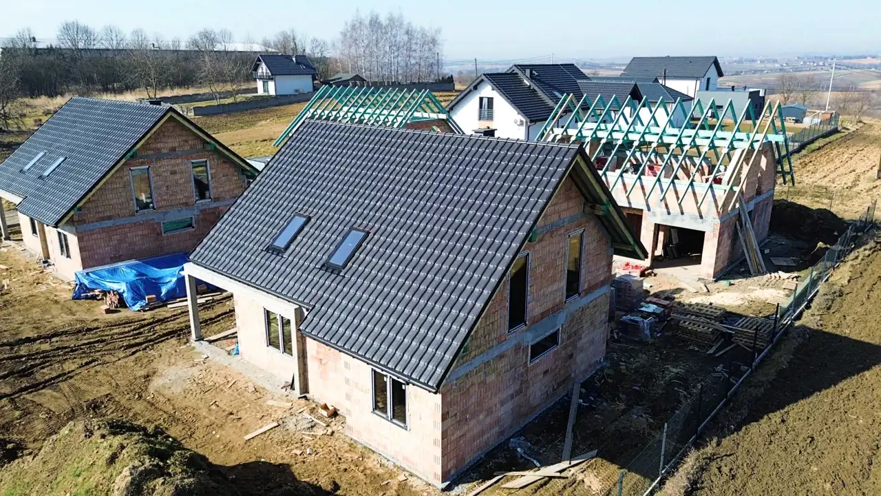 - Dom w stanie surowym zamkniętym – budynek posiada już okna oraz drzwi zewnętrzne, co zabezpiecza go przed warunkami atmosferycznymi.