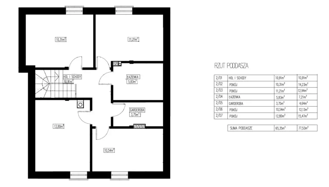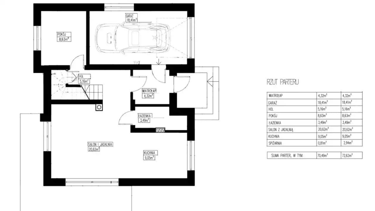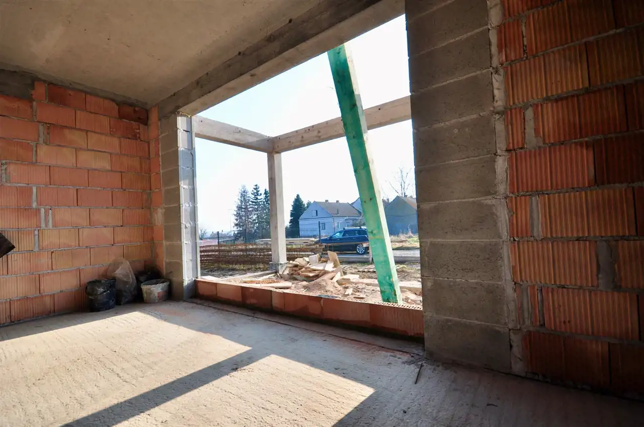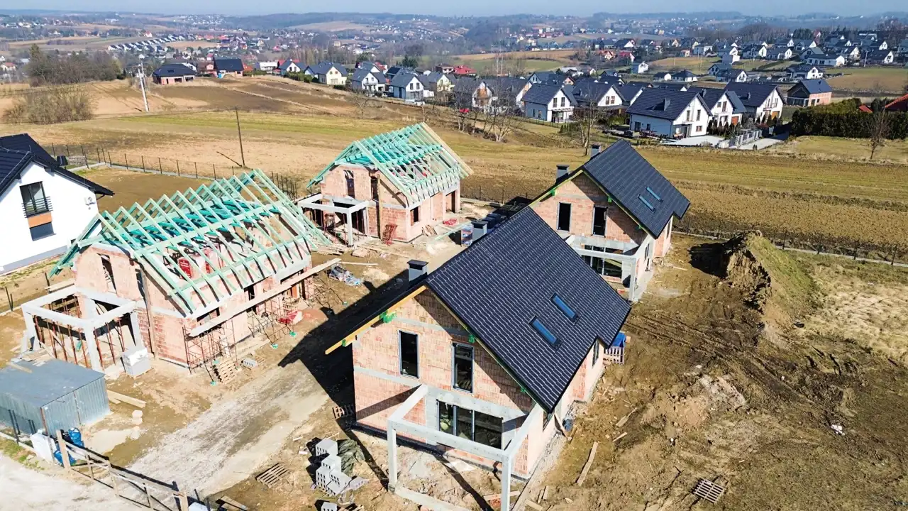 - Dom w stanie surowym zamkniętym – budynek posiada już okna oraz drzwi zewnętrzne, co zabezpiecza go przed warunkami atmosferycznymi.