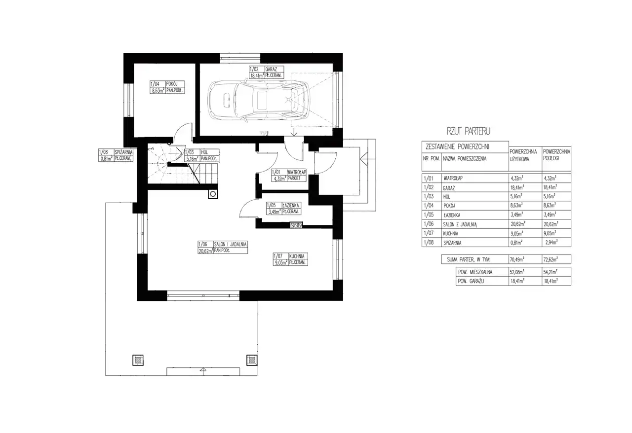 Parter (70,49m2): wiatrołap (4,32m2), hol (5,16m2), pokój (8,63m2), łazienka (3,49m2), spiżarka (0,81m2), kuchnia (9,05m2), salon + jadalnia (20,62m2), garaż (18,41m2)
