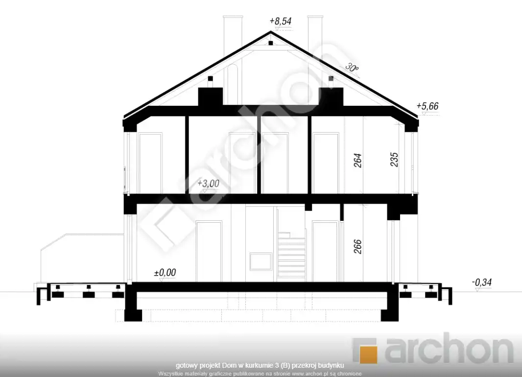 Dom został wybudowany według popularnego projektu „Dom w kurkumie 3 (B)” pracowni Archon, który łączy przemyślany układ pomieszczeń, komfort oraz nowoczesną estetykę. Powierzchnia użytkowa wynosi 97 m² i obejmuje 5 pokoi — to doskonała propozycja zarówno dla rodziny, jak i osób chcących połączyć życie prywatne z pracą zdalną.