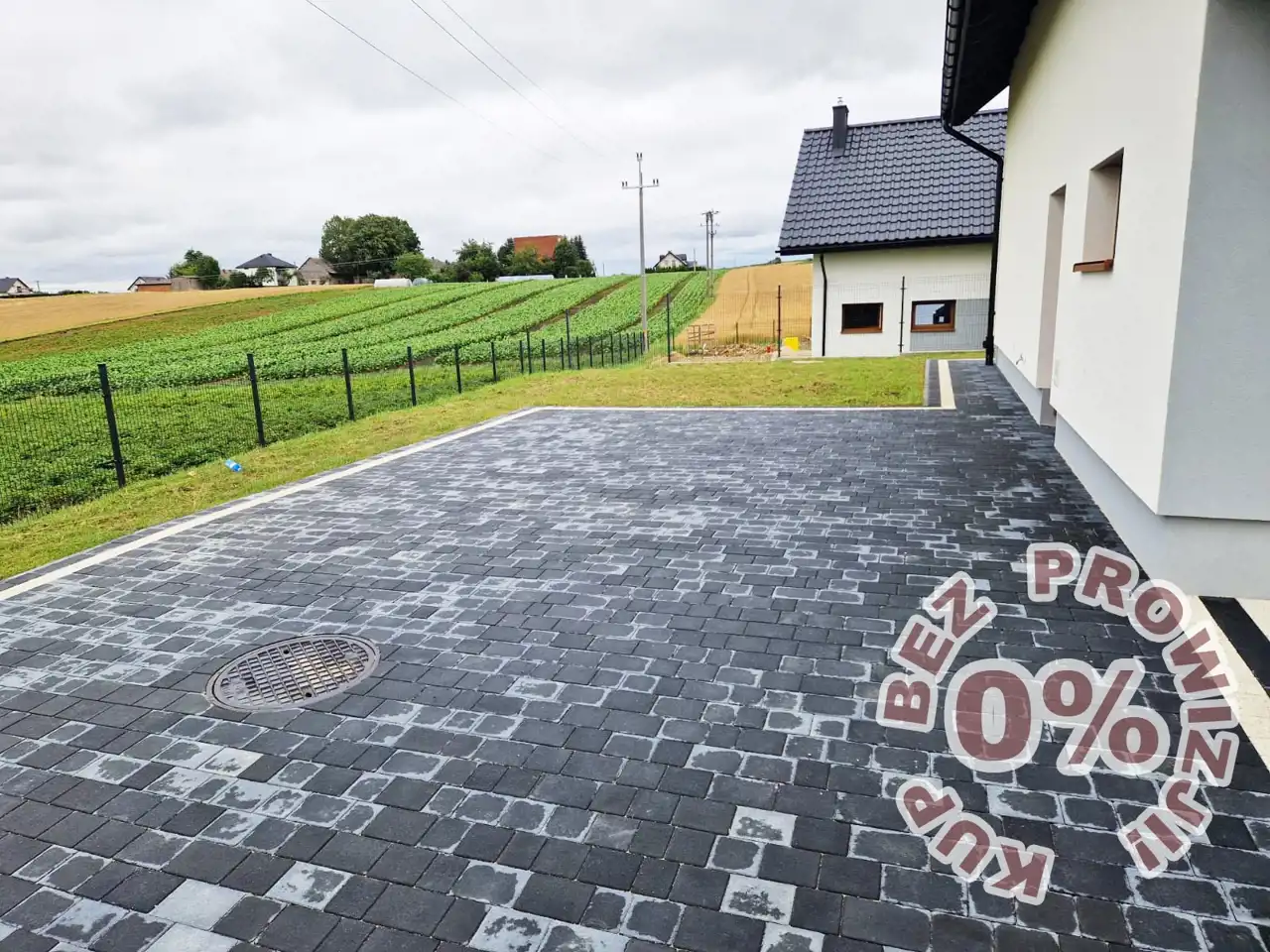 - podjazd, podejście i taras z kostki brukowej;