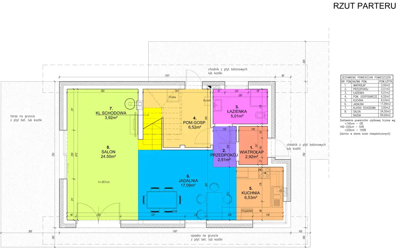Parter (69m2): wiatrołap (2,92m2), pom. gospodarcze (6,52m2), przedpokój (2,51m2), kuchnia (6,53m2), jadalnia (17,09m2), łazienka (5,01m2), klatka schodowa (3,92m2), salon (24,50m2).