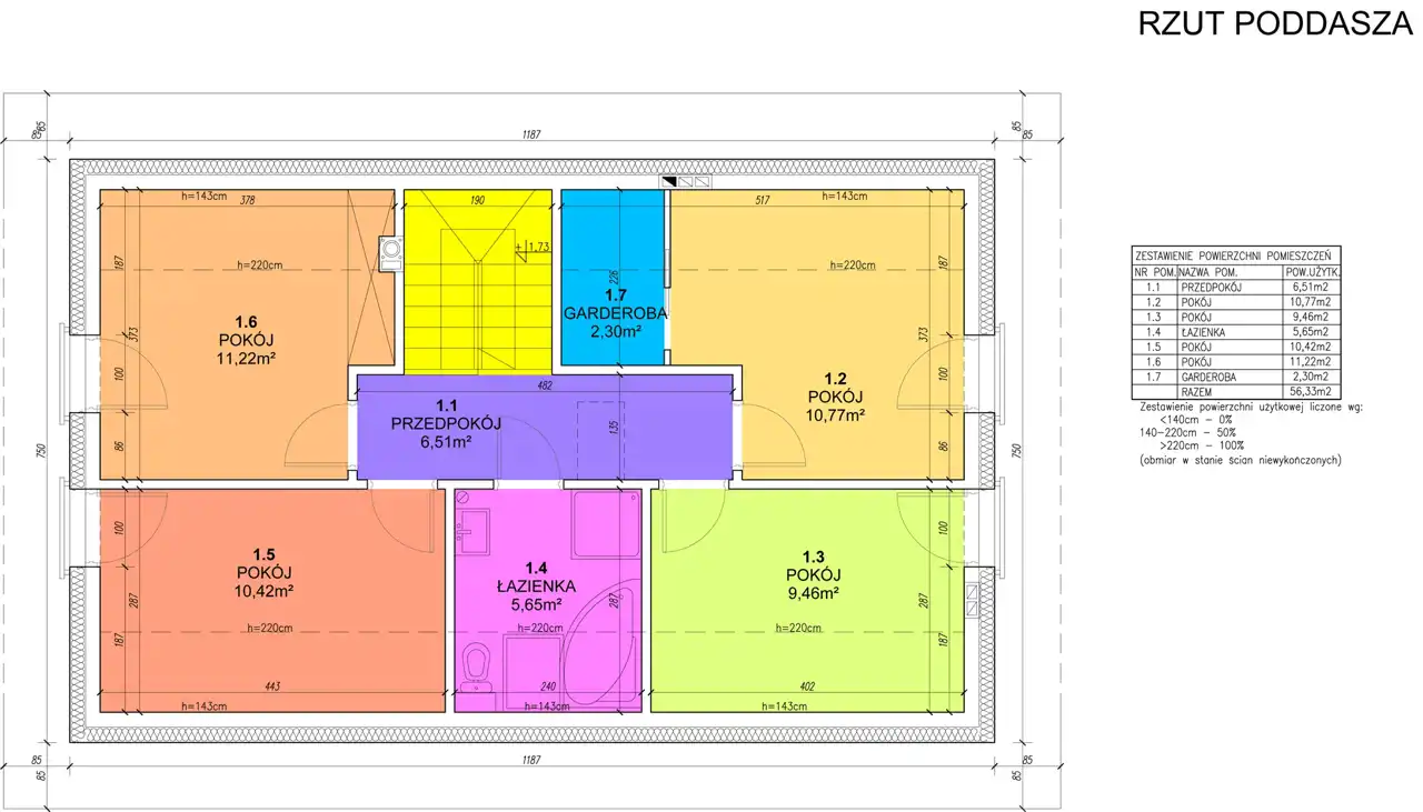 Poddasze (56,33m2): komunikacja (6,51m2), sypialnia (10,77m2), pokój (9,46m2), łazienka (5,65m2), sypialnia (10,42m2), sypialnia (11,22m2), garderoba (2,30m2).
