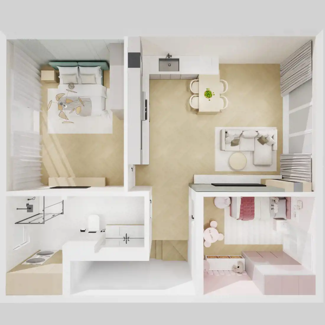 Każdy lokal został zaprojektowany z myślą o maksymalnym wykorzystaniu przestrzeni – mimo kompaktowej powierzchni zapewnia funkcjonalny układ pomieszczeń, w tym oddzielne dwa pokoje, salon z aneksem kuchennym, łazienkę i miejsce do przechowywania. Każde mieszkanie posiada prywatny ogródek - idealne miejsce do wypoczynku oraz spotkań z bliskimi.