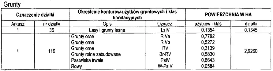 Nieruchomość to działka nr 116 o powierzchni 2,9260 ha, zabudowana budynkiem mieszkalnym oraz budynkami gospodarczymi o łącznej powierzchni zabudowy 661,00 m2.
