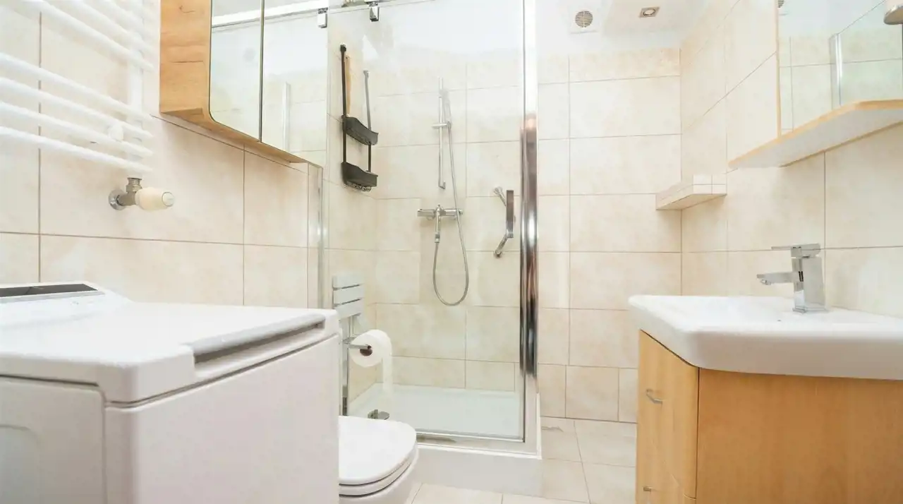 W łazience prysznic , jasne kafle.