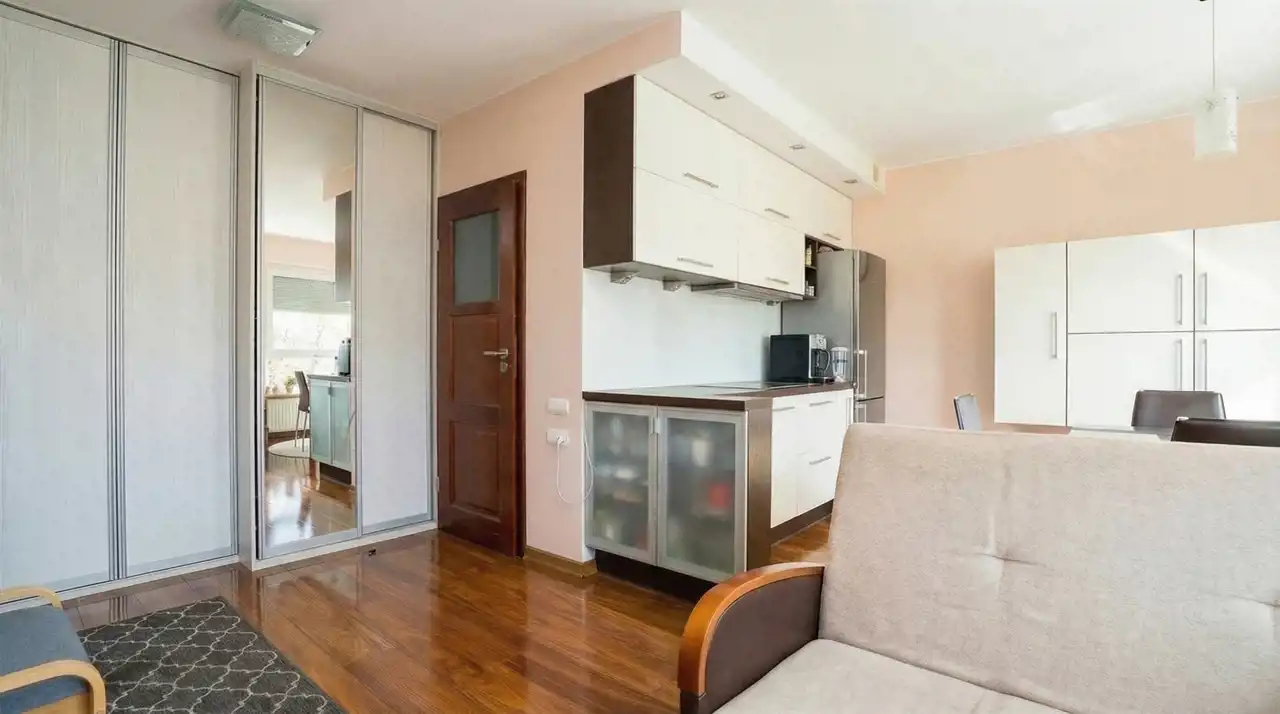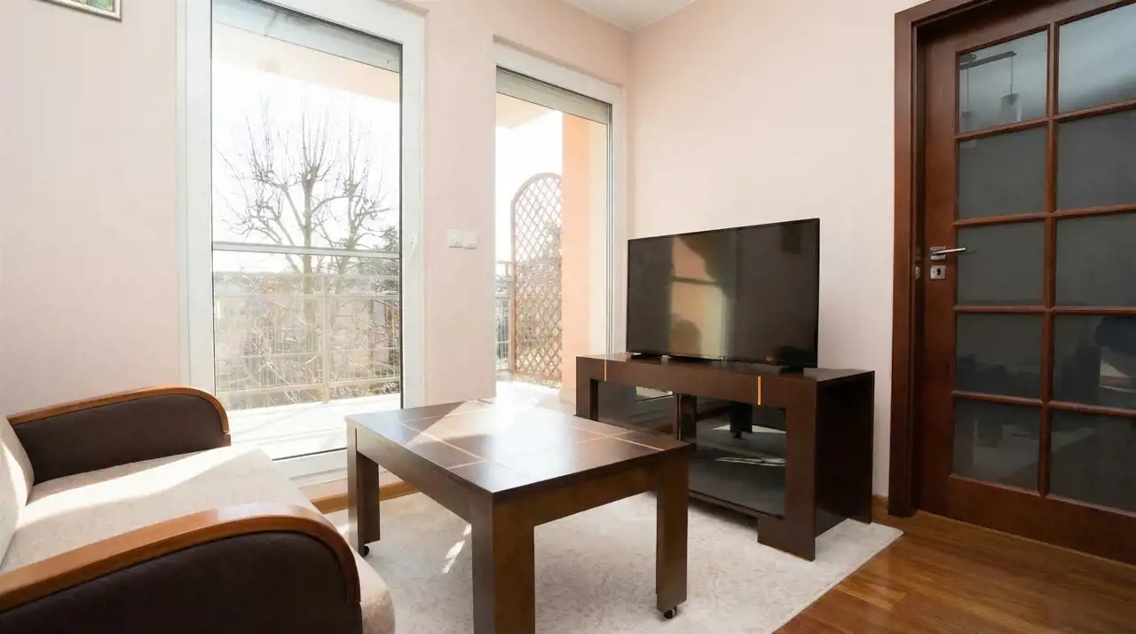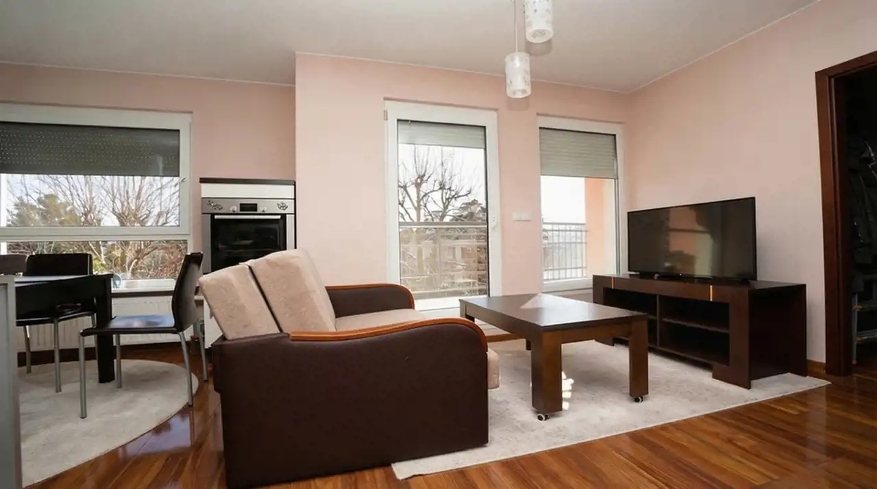 Salon podzielony na dwie strefy, kuchnia z jadalnią oraz strefa wypoczynkowa. Z salonu wyjście na słoneczny balkon z ładnym widokiem na wille.