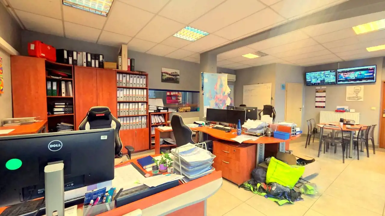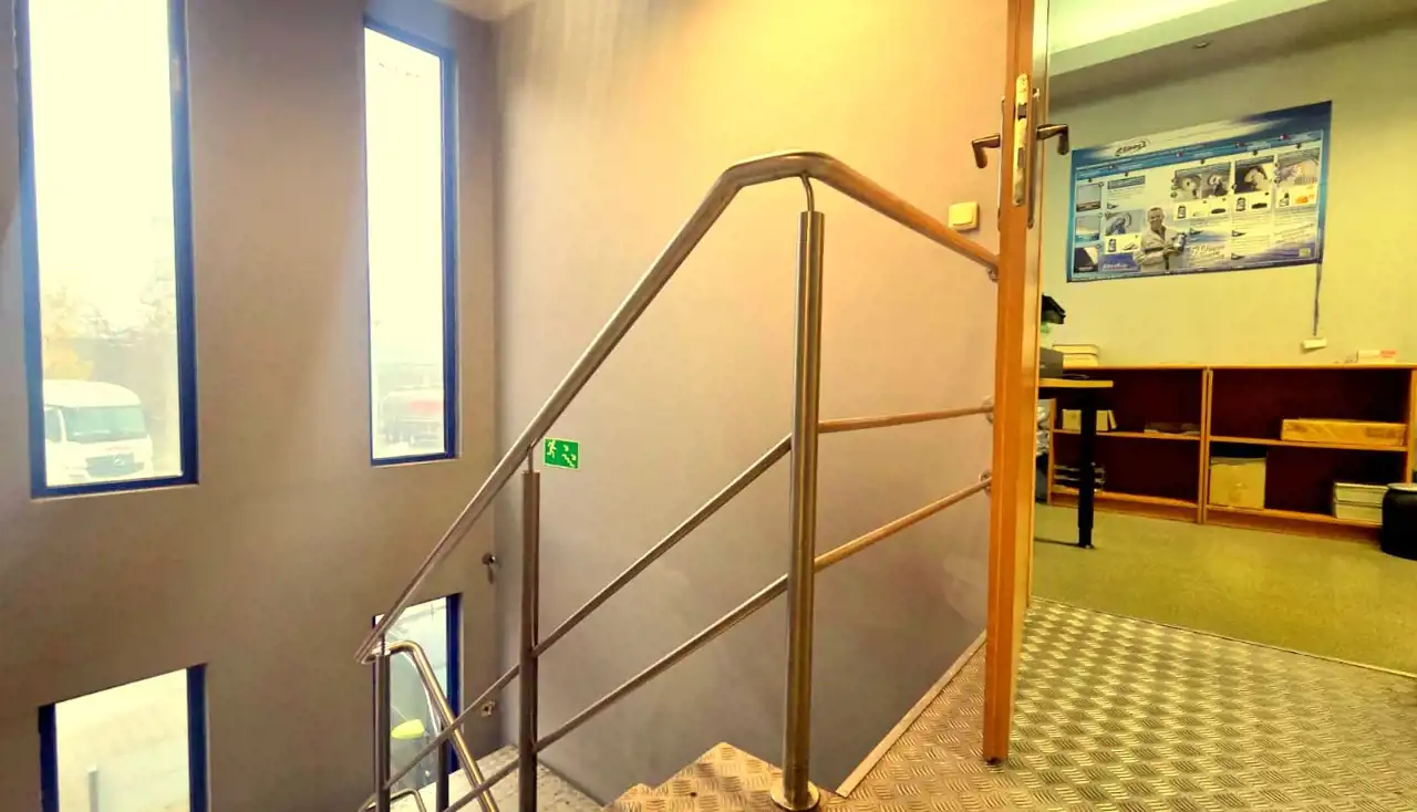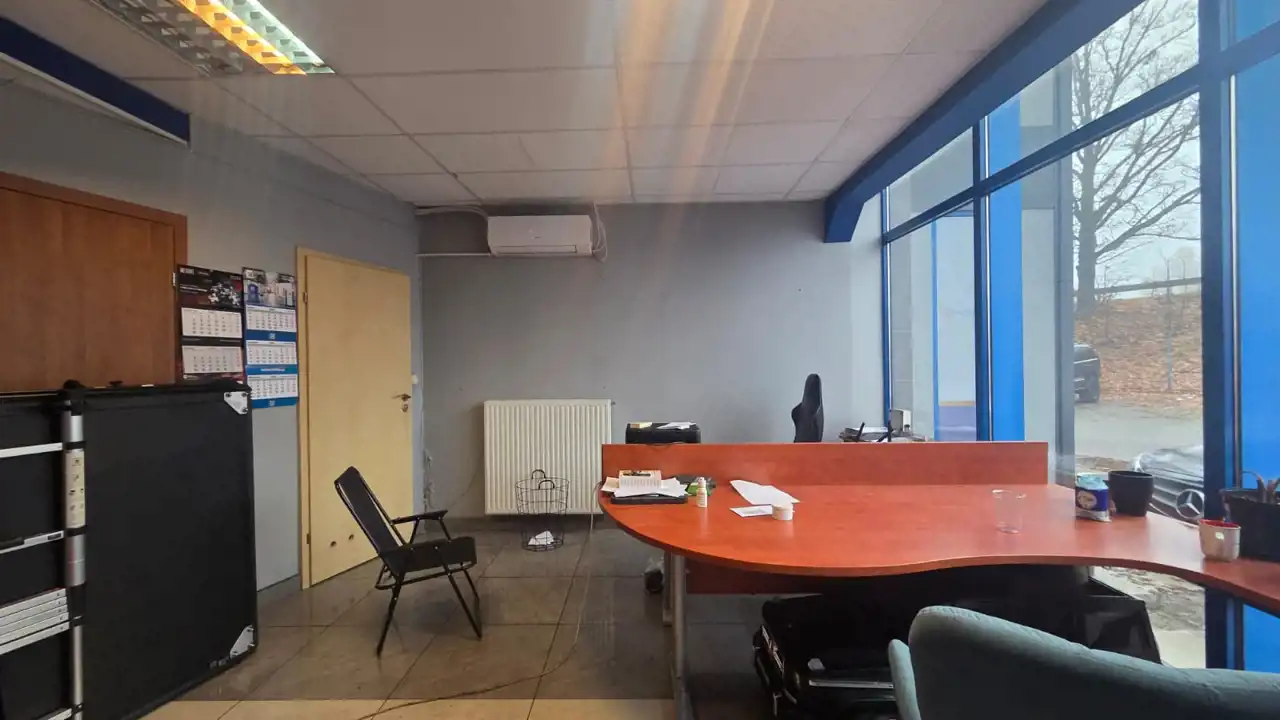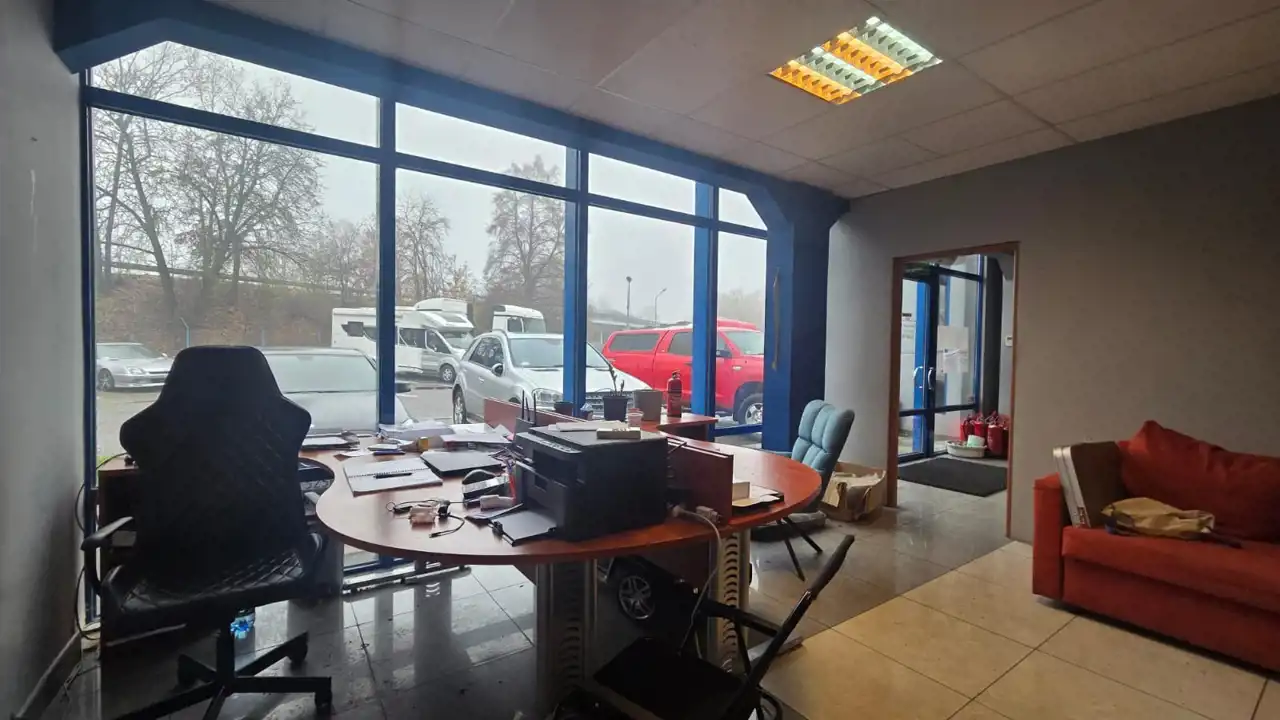 • Główne biuro z dużym przeszkleniem i widokiem na plac manewrowy