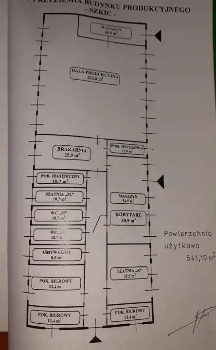 Budynek wolnostojący, jednokodygnacyjny bez poddasza i podpiwniczenia wykonany w technologii tradycyjnej o pow. użytkowej: 541 mkw. (pow.: produkcyjno - magazynowa: 350 mkw., pow. biurowo - socjalna: 190 mkw.) wybudowany w latach 1995 - 1998 w DOBRYM STANIE TECHNICZNYM. Wysokość w świetle pomieszczeń: 3,2 m. KONSTRUKCJA: pustaki żużlobetonowe; DACH: dwuspadowy, stalowy, DRZWI WEW.: drewniane, DRZWI ZEW.: profile PCV, BRAMA WJAZDOWA DO MAGAZYNU: uchylna w konstrukcji stalowej, ŚCIANY: tynki cementowo - wapienne pomalowane farbą lub płytki, SUFITY: podwieszane, POSADZKI: wykładziny PCV (cz. socjalno - biurowa), cementowe pokryte durobetem (cz. magazynowa i produkcyjna), terakota (pom. sanitarne). INSTALACJE: elektryczność, wod-kan z sieci miejskiej, teletechniczna i odgromowa, C.O.: lokalne elektryczne.