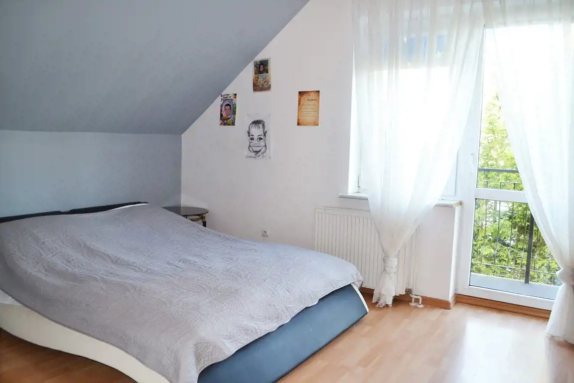 - Balkon, taras nad garażem i taras z salonu (wyjście na ogród).