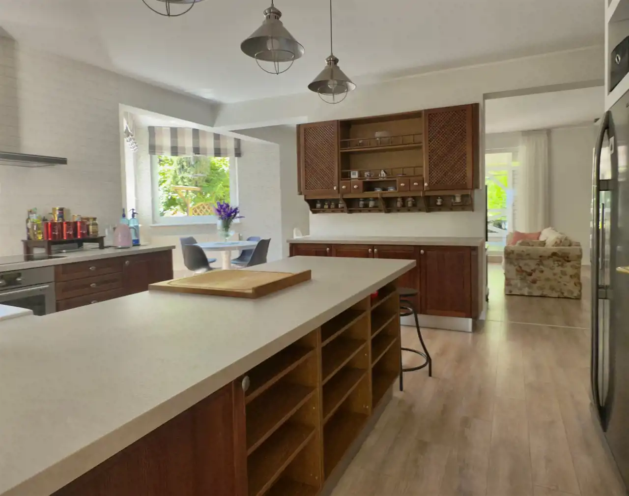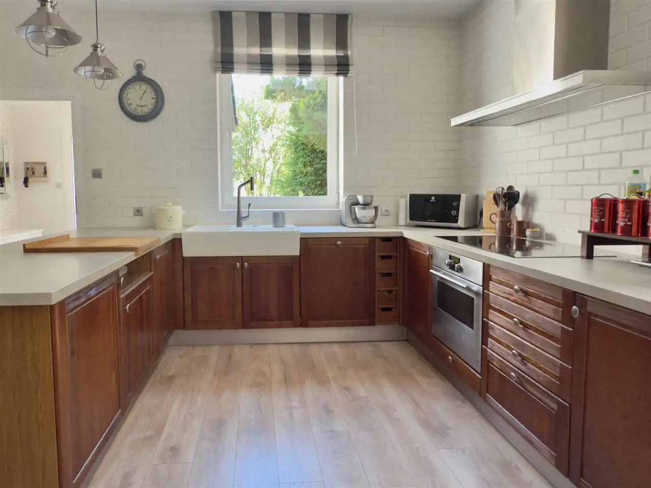 - klasyczna otwarta kuchnia z oknem, dużą ilością blatów roboczych, meble drewniane,