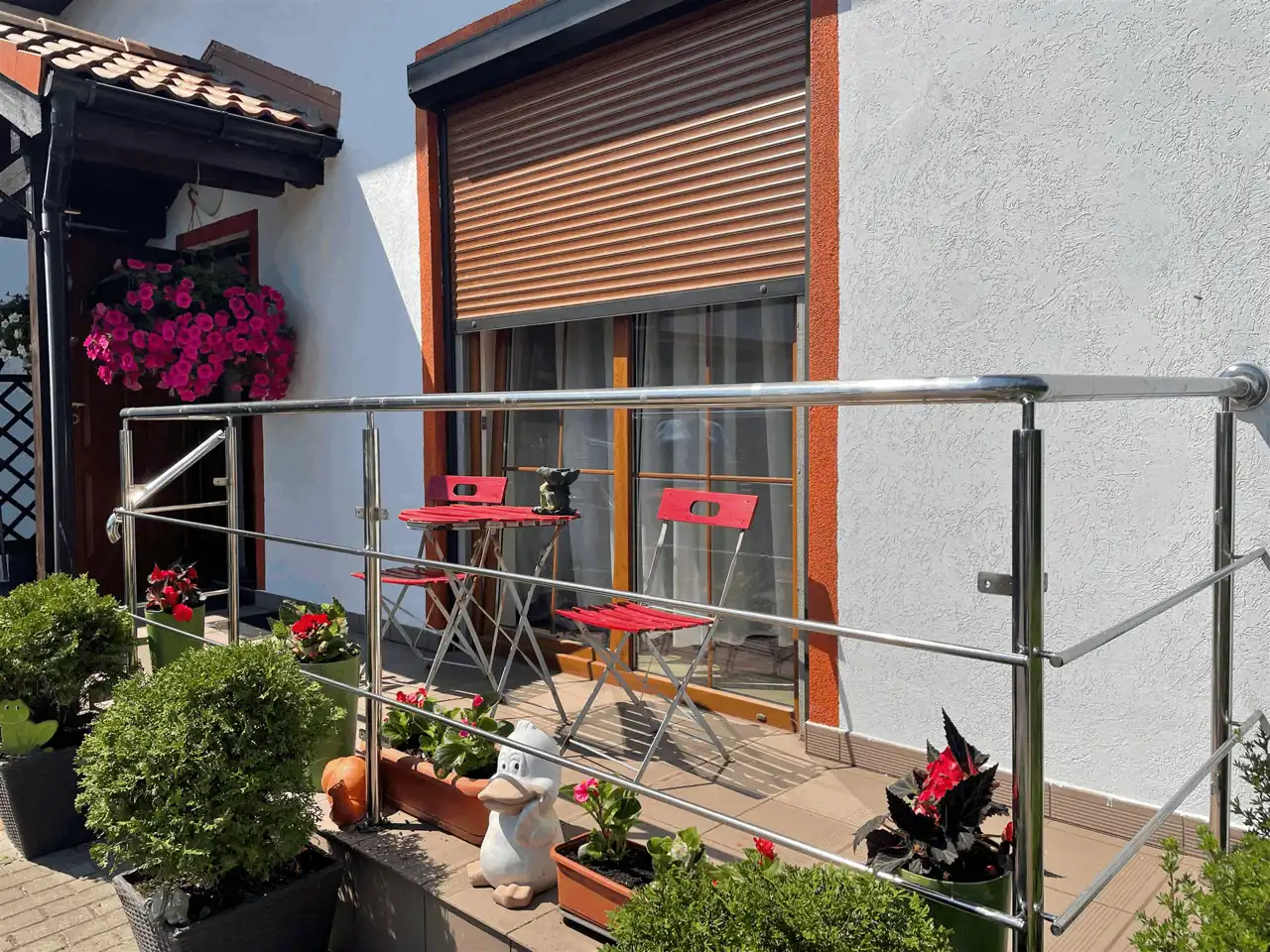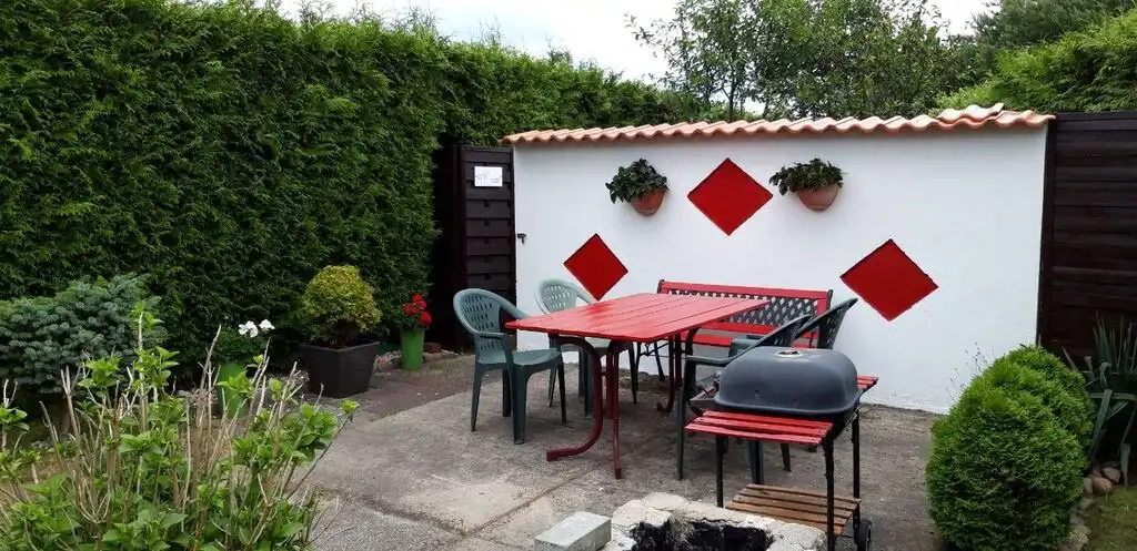 Zadbany ogród z wypielęgnowaną przestrzenią do relaksu i różanymi krzewami.