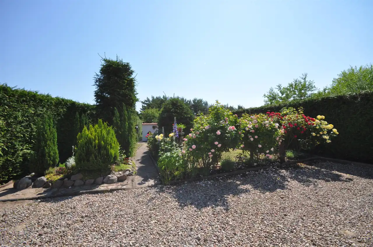 Ogrodzony, z wysokim, zielonym żywopłotem i brama wjazdową na żwirowy parking dla wszystkich o