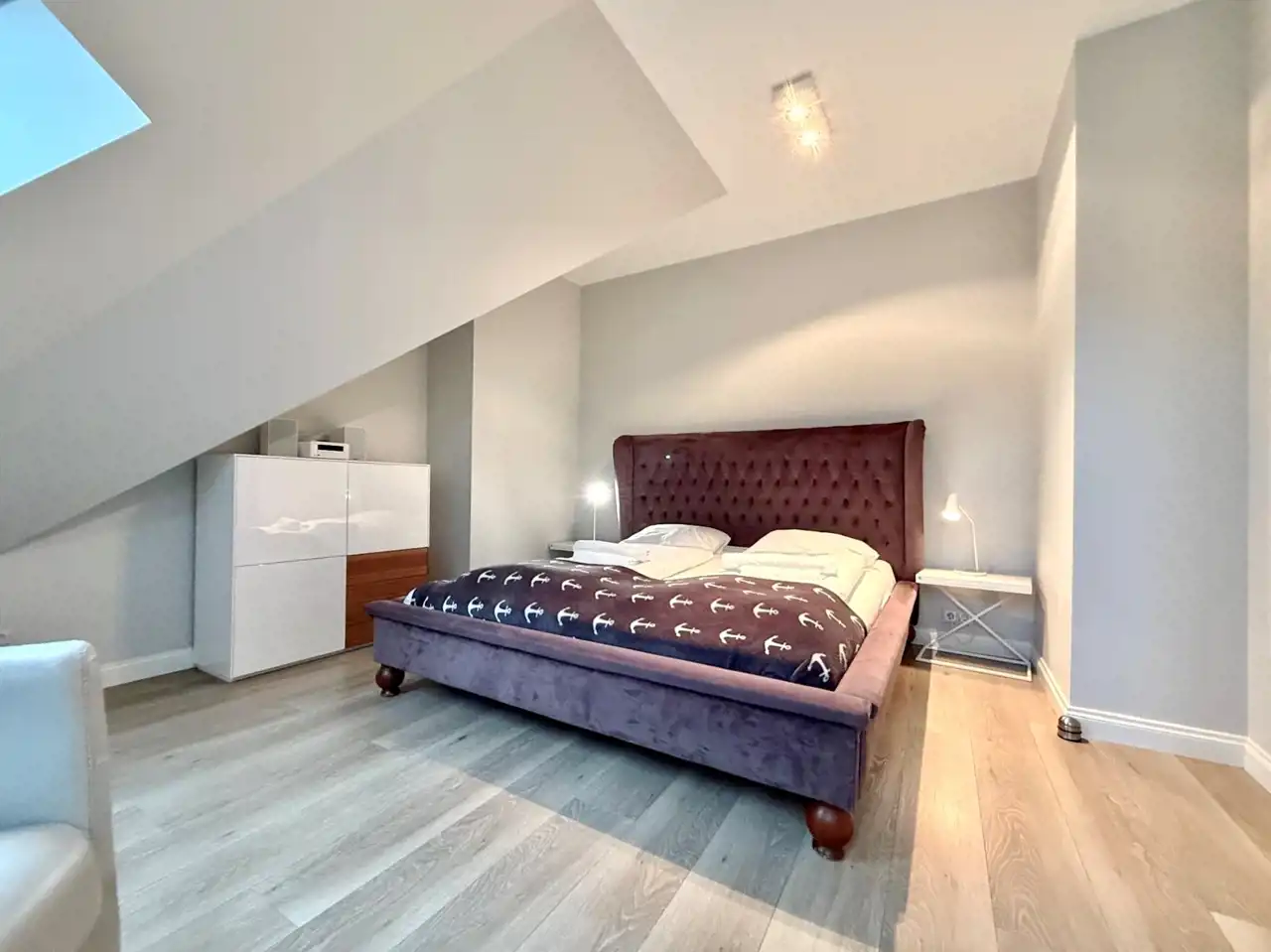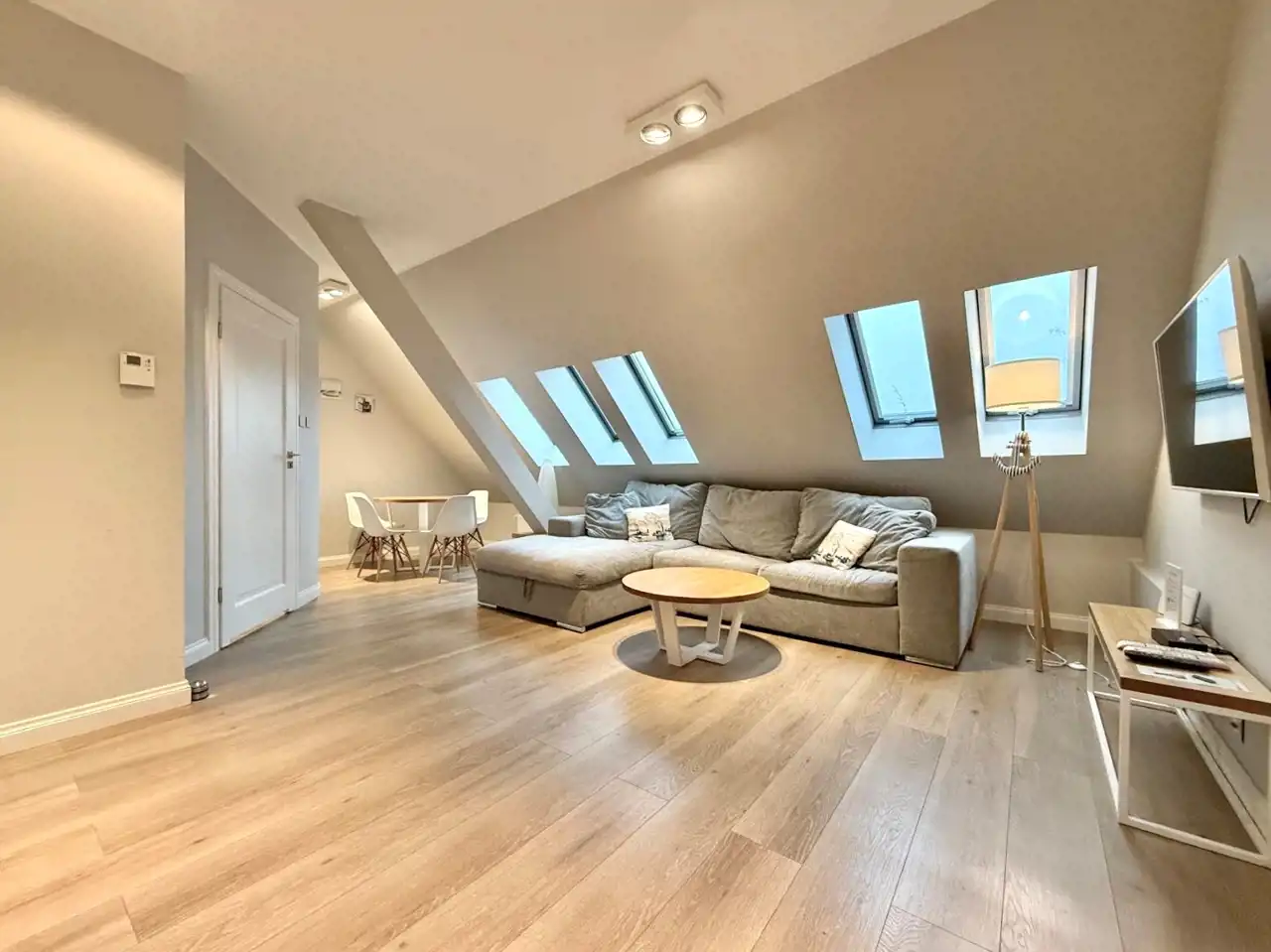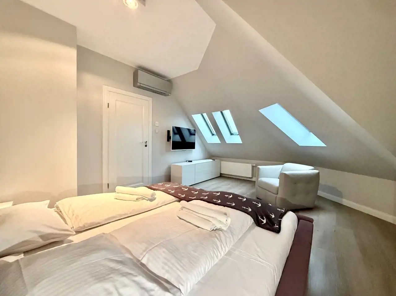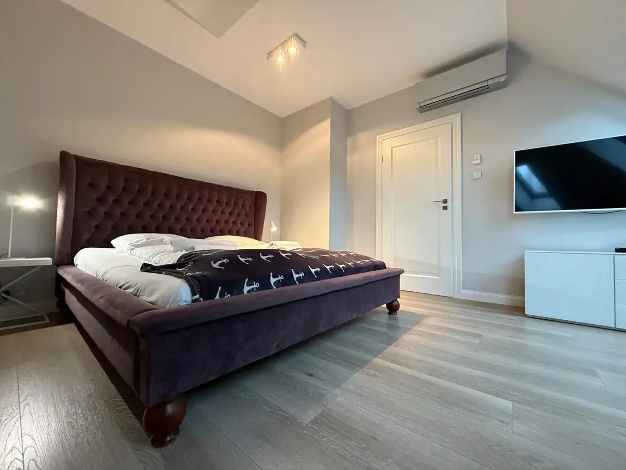 W części wypoczynkowej także wydzielona część jadalniana. Przytulna jasna sypialnia z dużym łóżkiem i telewizorem.