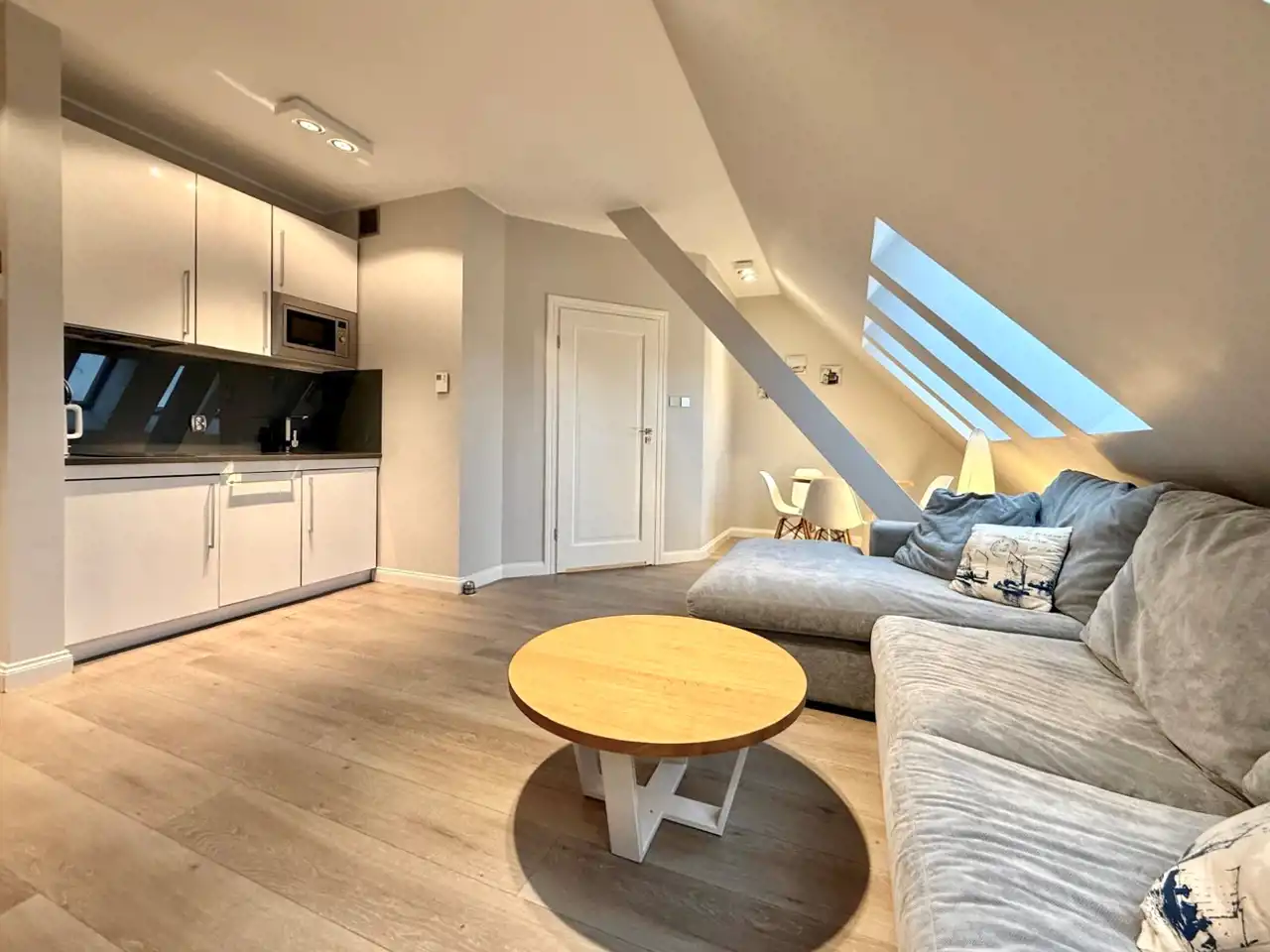 - przestronnego salonu z aneksem kuchennym - jasna otwarta przestrzeń idealna do spędzania czasu po spacerze na plaży